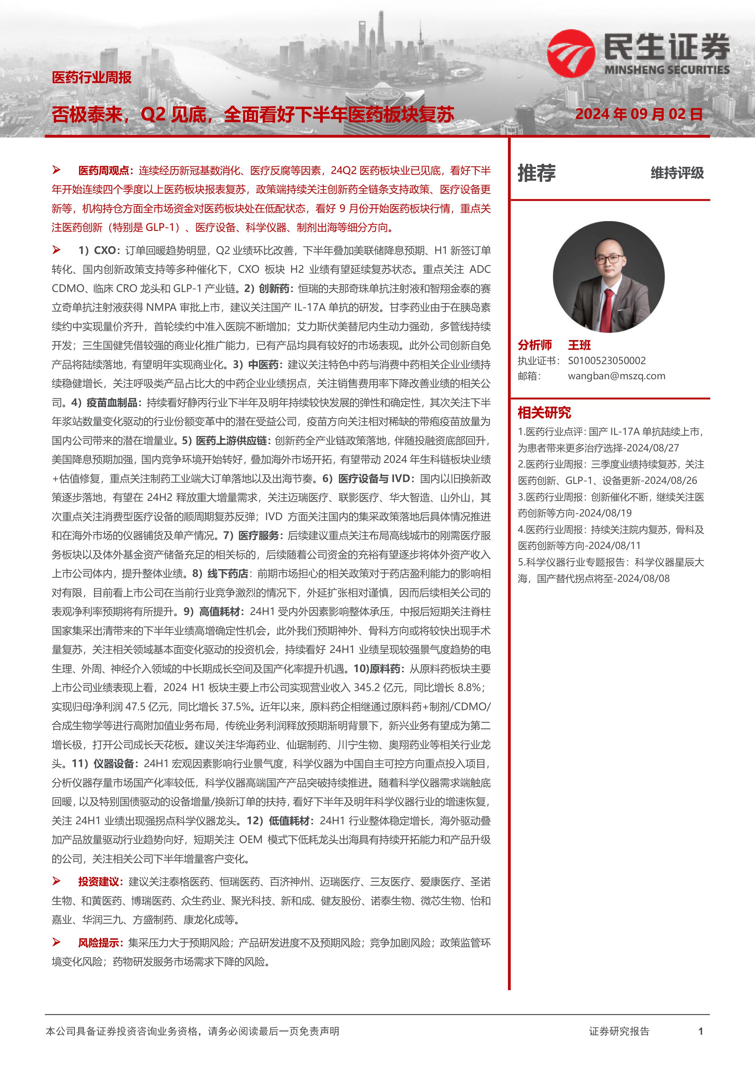 1)CXO:订单回暖趋势明显,Q2业绩环比改善,下半年叠加美联储降息预期、H1新签订单转化、国内创新政策支持等多种催化下,CXO板块H2业绩有望延续复苏状态。重点关注ADCCDMO、临床CRO龙头和GLP-1产业链。2)创新药:恒瑞的夫那奇珠单抗注射液和智翔金泰的赛立奇单抗注射液获得NMPA审批上市,建议关注国产IL-17A单抗的研发。甘李药业由于在胰岛素续约中实现量价齐升,首轮续约中准入医院不断增加;艾力斯伏美替尼内生动力强劲,多管线持续开发;三生国健凭借较强的商业化推广能力,已有产品均具有较好的市场表现。此外公司创新自免产品将陆续落地,有望明年实现商业化。3)中医药:建议关注特色中药与消费中药相关企业业绩持续稳健增长,关注呼吸类产品占比大的中药企业业绩拐点,关注销售费用率下降改善业绩的相关公司。4)疫苗血制品:持续看好静丙行业下半年及明年持续较快发展的弹性和确定性,其次关注下半年浆站数量变化驱动的行业份额变革中的潜在受益公司,疫苗方向关注相对稀缺的带疱疫苗放量为国内公司带来的潜在增量业。5)医药上游供应链:创新药全产业链政策落地,伴随投融资底部回升美国降息预期加强,国内竞争环境开始转好,叠加海外市场开拓,有望带动2024年生科链板块业绩+估值修复,重点关注制药工业端大订单落地以及出海节奏。6)医疗设备与IVD:国内以旧换新政策逐步落地,有望在24H2释放重大增量需求,关注迈瑞医疗、联影医疗、华大智造、山外山,其次重点关注消费型医疗设备的顺周期复苏反弹;IVD方面关注国内的集采政策落地后具体情况推进和在海外市场的仪器铺货及单产情况。7)医疗服务:后续建议重点关注布局高线城市的刚需医疗服务板块以及体外基金资产储备充足的相关标的,后续随着公司资金的充裕有望逐步将体外资产收入上市公司体内,提升整体业绩。8)线下药店:前期市场担心的相关政策对于药店盈利能力的影响相对有限,目前看上市公司在当前行业竞争激烈的情况下,外延扩张相对谨慎,因而后续相关公司的表观净利率预期将有所提升。9)高值耗材:24H1受内外因素影响整体承压,中报后短期关注脊柱国家集采出清带来的下半年业绩高增确定性机会,此外我们预期神外、骨科方向或将较快出现手术量复苏,关注相关领域基本面变化驱动的投资机会,持续看好24H1业绩呈现较强景气度趋势的电生理、外周、神经介入领域的中长期成长空间及国产化率提升机遇。10)原料药:从原料药板块主要上市公司业绩表现上看,2024H1板块主要上市公司实现营业收入345.2亿元,同比增长8.8%;实现归母净利润47.5亿元,同比增长37.5%。近年以来,原料药企相继通过原料药+制剂/CDMO/合成生物学等进行高附加值业务布局,传统业务利润释放预期渐明背景下,新兴业务有望成为第二增长极,打开公司成长天花板。建议关注华海药业、仙琚制药、川宁生物、奥翔药业等相关行业龙头。11)仪器设备:24H1宏观因素影响行业景气度,科学仪器为中国自主可控方向重点投入项目分析仪器存量市场国产化率较低,科学仪器高端国产产品突破持续推进。随着科学仪器需求端触底回暖,以及特别国债驱动的设备增量/换新订单的扶持,看好下半年及明年科学仪器行业的增速恢复关注24H1业绩出现强拐点科学仪器龙头。12)低值耗材:24H1行业整体稳定增长,海外驱动叠加产品放量驱动行业趋势向好,短期关注OEM模式下低耗龙头出海具有持续开拓能力和产品升级的公司,关注相关公司下半年增量客户变化。