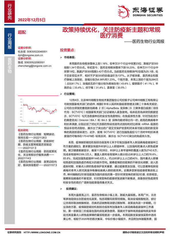 医药生物行业周报:政策持续优化,关注防疫新主题和常规医疗消费