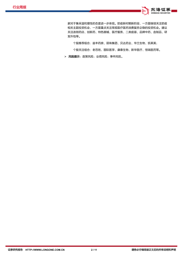 报告建议关注连锁药店、创新药、特色器械、医疗服务、二类疫苗、品牌中药、血制品、研发外包等领域。 推荐个股组合包括益丰药房、丽珠集团、贝达药业、华兰生物、凯莱英;关注个股组合包括老百姓、国际医学、康泰生物、新华医疗、恒瑞医药等。 报告也提示了政策风险、业绩风险和事件风险,投资者需谨慎投资。