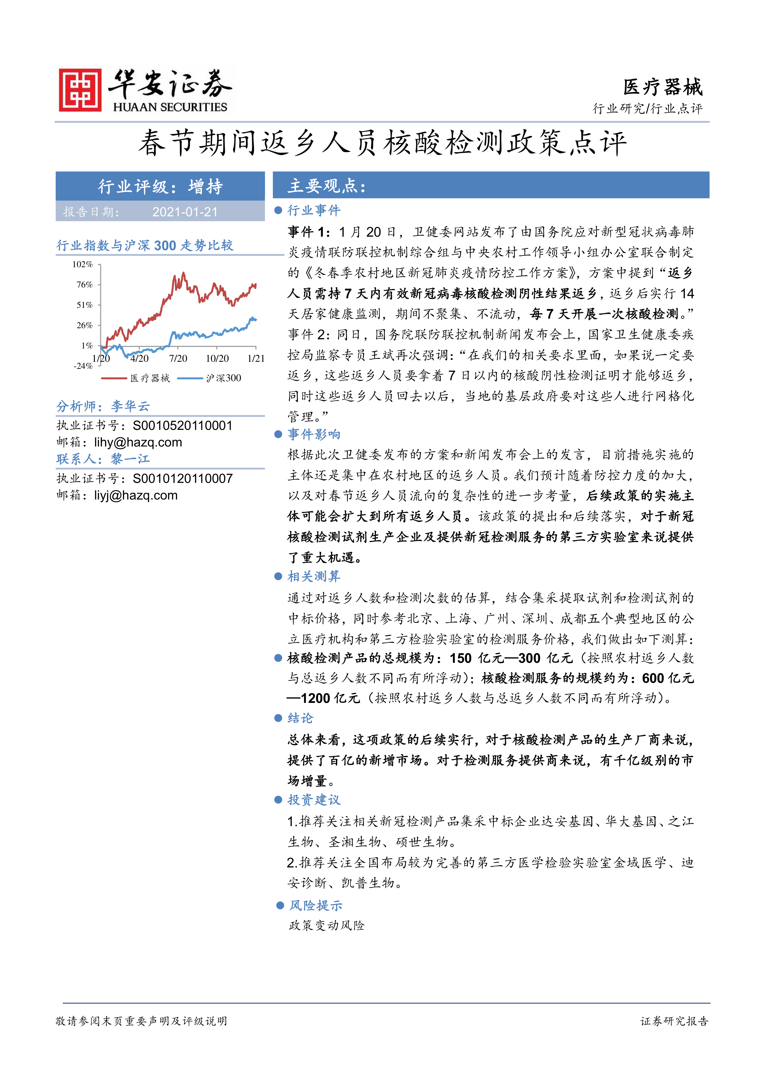 医疗器械行业点评:春节期间返乡人员核酸检测政策点评