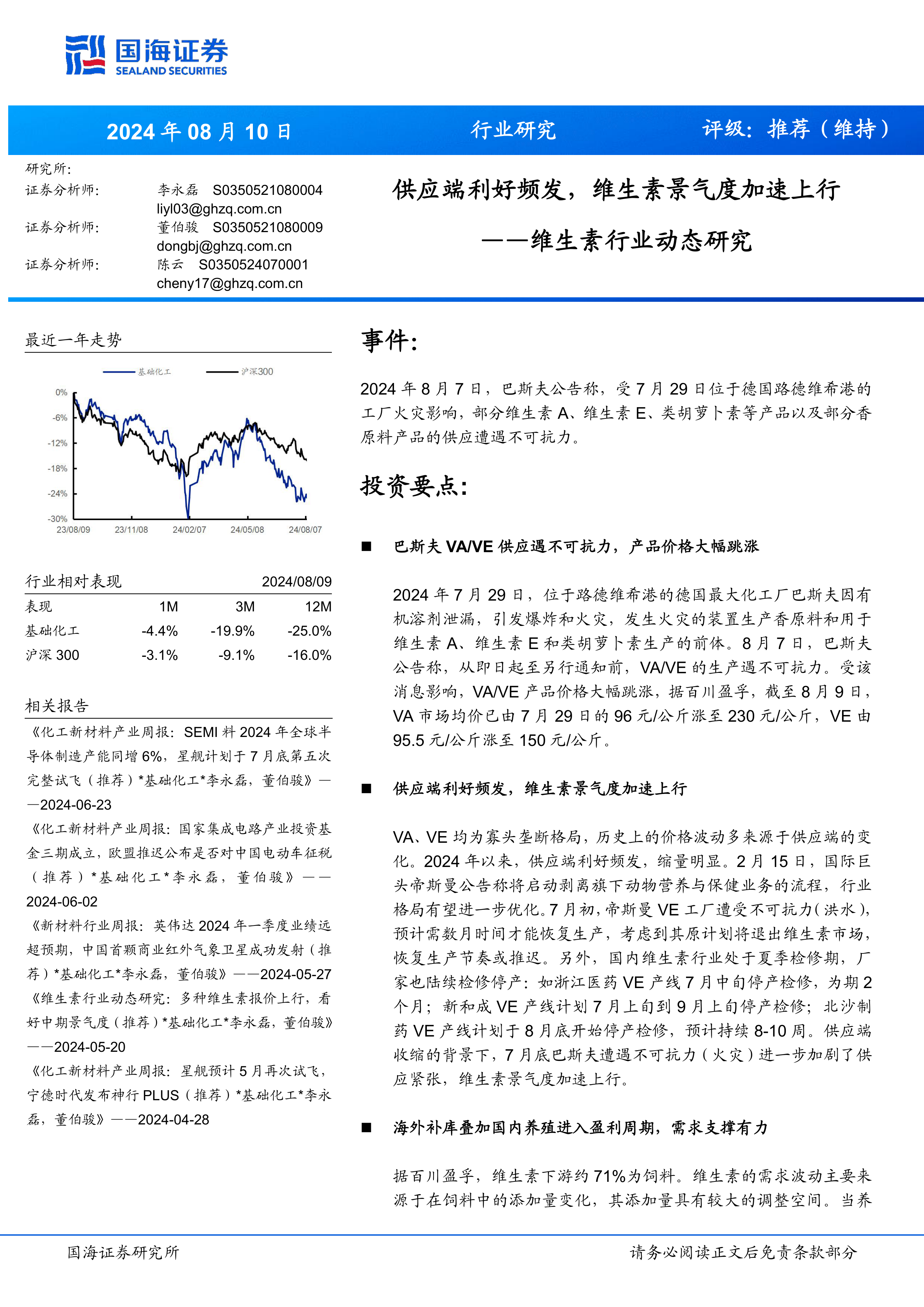 本报告基于2024年8月10日发布,对维生素行业进行了动态研究,并给出了“推荐”评级(维持)。报告主要内容如下: