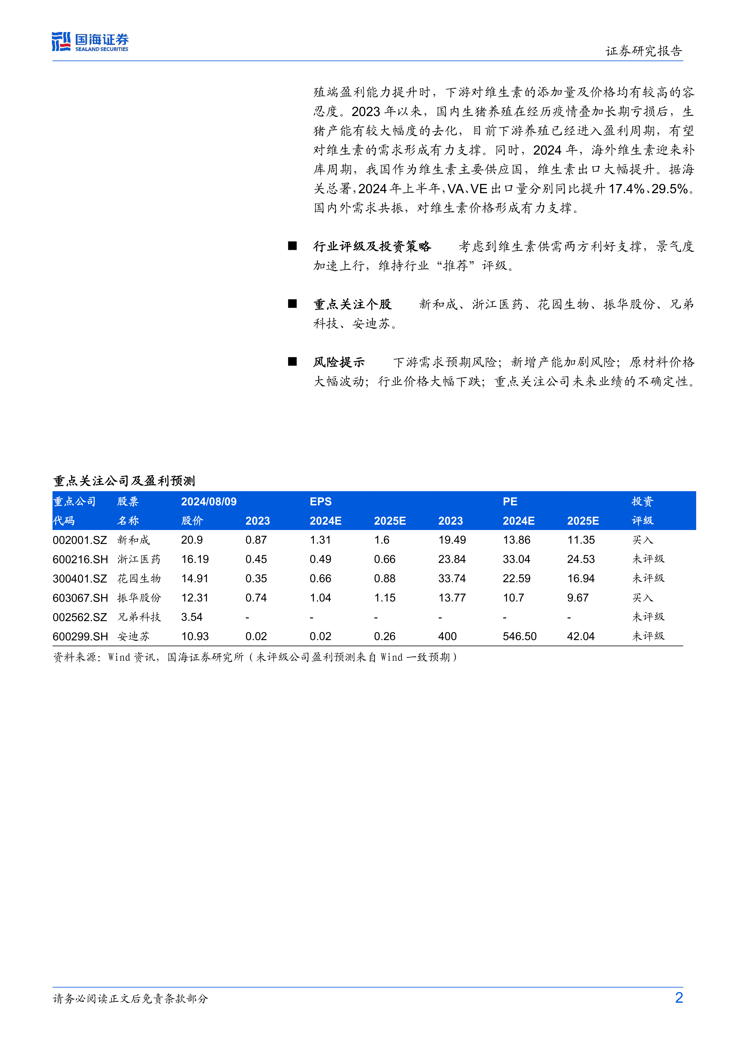 报告提供了部分重点维生素生产企业的股票代码、股价、2023年、2024年及2025年的每股收益(EPS)和市盈率(PE)预测数据,并对部分公司给出了“买入”评级。 数据来源为Wind资讯和国海证券研究所。