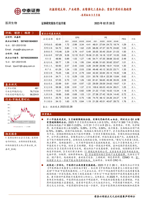 本报告的核心观点是:3月份医药行业投资机会主要集中在困境反转、产业趋势和业绩催化三类公司,其中,中药板块的长期趋势值得关注。报告基于2月份医药板块表现及近期政策变化,建议投资者结合产业发展趋势、估值水平和短期催化因素选择投资标的。中小市值公司表现优于大市值公司,一季报业绩预期也成为重要的参考指标。
