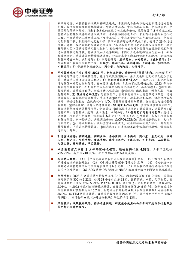 中小市值表现更优,3月继续围绕低估值、有催化思路寻找α机会,同时关注Q1业绩有望超预期的企业。2023年2月医药生物板块上涨0.12%,同期沪深300下跌2.10%,医药板块跑赢沪深300约2.22%,位列31个子行业第23位。医药商业、中药、化学制药、医疗器械分别上涨5.52%、5.29%、2.17%、0.50%,医疗服务、生物制品分别下跌6.70%、2.06%。前期子板块轮涨、短期缺乏催化的大背景下,2月医药板块整体表现较为平淡,前期强势的板块及个股有所调整,行情更多围绕低估值、有催化的细分领域展开,如中药注册新政、零售药店纳入门诊统筹管理、科技仪器设备国产化、流感爆发等。当下处于预期部分修复、业绩尚未兑现的真空期,行情轮动加快,“催化”尤为重要(政策、热点事件、高频数据等)。从不同市值标的月度涨跌幅来看,近几个月整体表现上中小市值更优于大市值。经历2月的调整,考虑一季报逐步明朗,叠加近期多重政策催化,我们认为3月医药行情更为乐观,建议结合产业发展趋势、当前估值、短期催化等多种维度寻找标的,3月我们重点看好:1)困境反转类的公司,且具备未来2-3年的成长性,包括中药、仿制药、创新药等板块。2)符合国家积极引导的产业发展趋势,包括自主可控、国产替代、高端制造等,看好医疗设备、上游耗材、特色原料药、CDMO等。3)短期重点关注一季报可能业绩亮眼的板块,包括药店、仿制药CRO等。