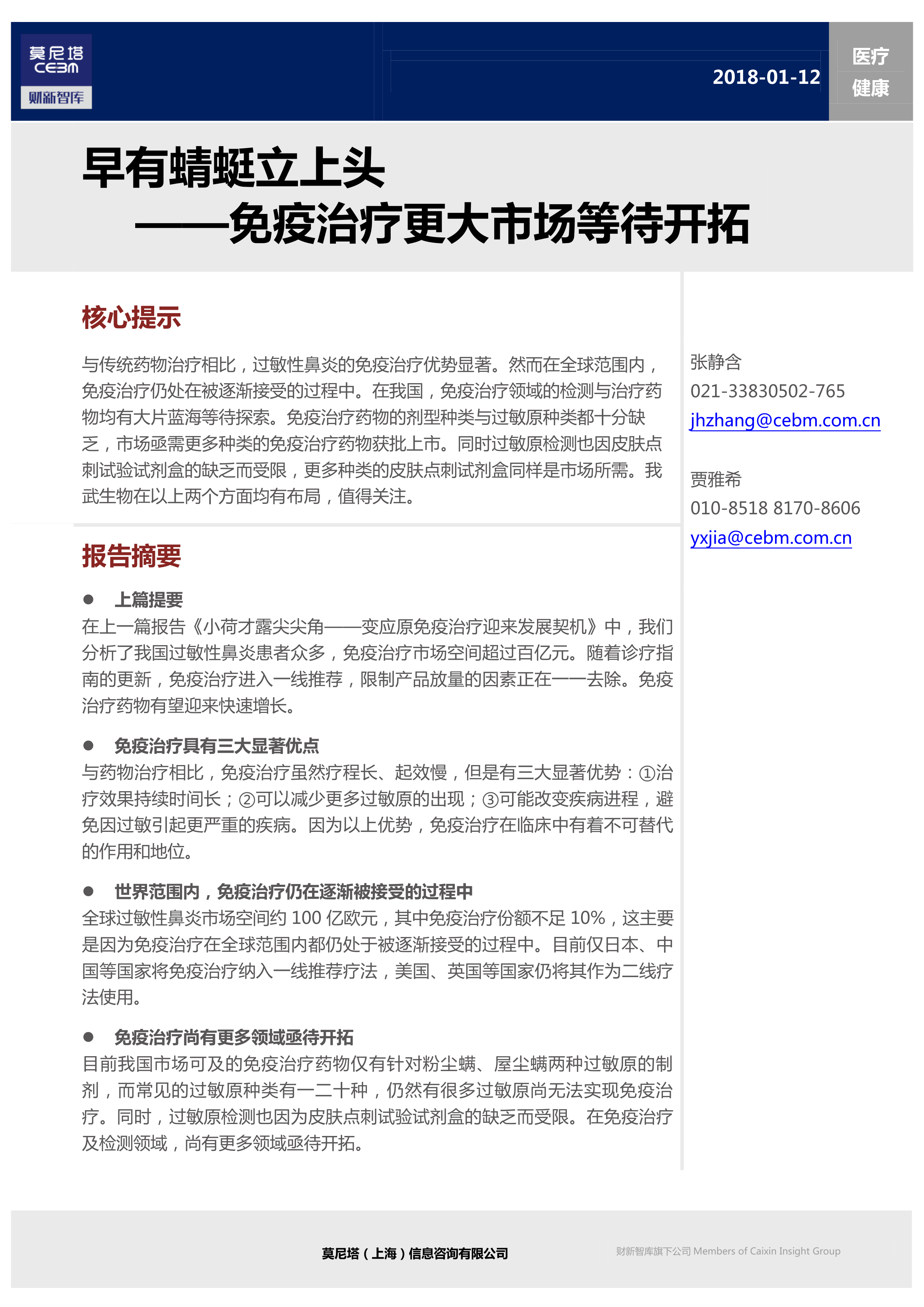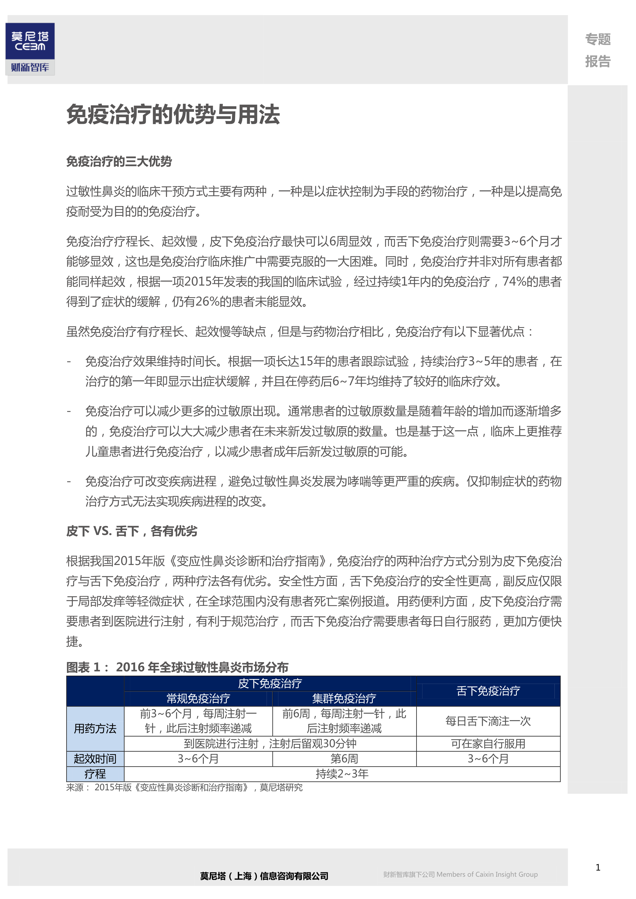本报告分析了过敏性鼻炎免疫治疗的优势和市场潜力,指出免疫治疗相比传统药物治疗具有显著优势,包括疗效持久、减少过敏原种类和改变疾病进程。