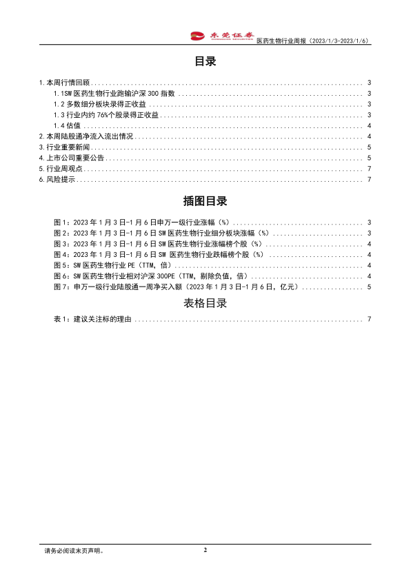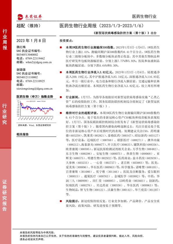本报告对2023年1月3日至6日医药生物行业进行了周度回顾和分析。 行业整体表现略逊于沪深300指数,但多数细分板块和个股仍录得正收益,行业估值处于相对低位。《新型冠状病毒感染防控方案(第十版)》的发布将对行业发展产生深远影响。 报告维持对医药生物行业的超配评级,并推荐关注多个细分领域的优质公司,同时提醒投资者注意多种潜在风险。 报告数据主要来自Wind数据库和东莞证券研究所,投资者应谨慎判断,风险自担。