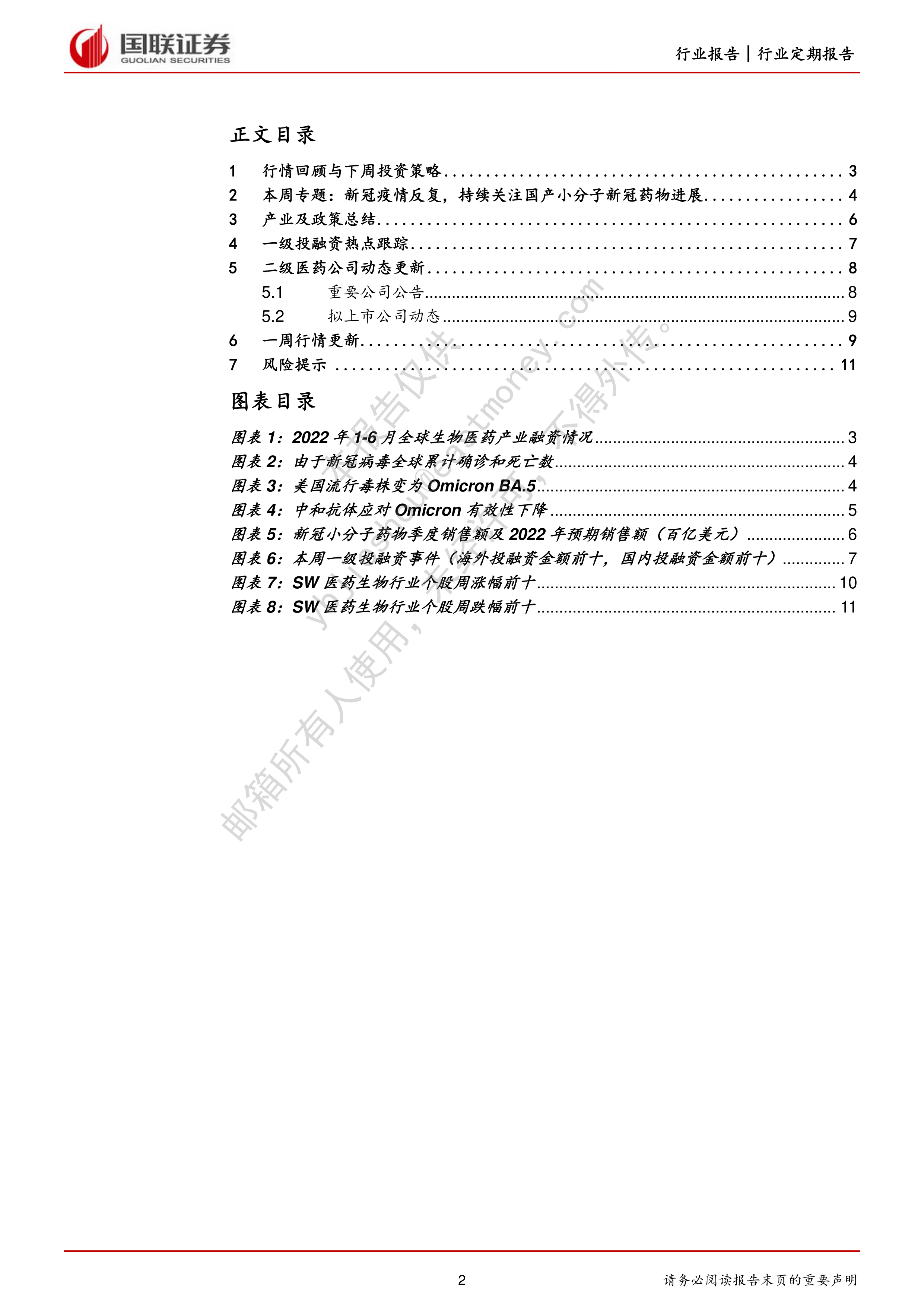 本报告的核心观点是:在新冠疫情反复的背景下,医药生物行业表现强于大盘,创新药产业链、疫苗和医疗服务等赛道值得关注。投融资数据环比改善,为创新产业链带来利好。同时,报告也持续关注国产小分子新冠药物的进展,并对部分公司进行投资建议。