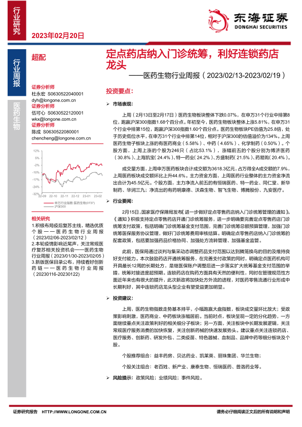 本报告对2023年2月13日至17日医药生物板块的市场表现进行了全面分析,重点关注了国家医保局关于定点零售药店纳入门诊统筹的政策,并对其对医药零售行业的影响进行了深入解读。报告认为,该政策将长期利好医药零售流通行业,特别是连锁药店龙头企业。同时,报告也指出了板块内部的分化趋势,并提出了相应的投资建议和风险提示,为投资者提供了参考依据。 报告数据主要来源于Wind数据库,并结合了公司公告等信息。 需要注意的是,投资有风险,投资者需谨慎决策。