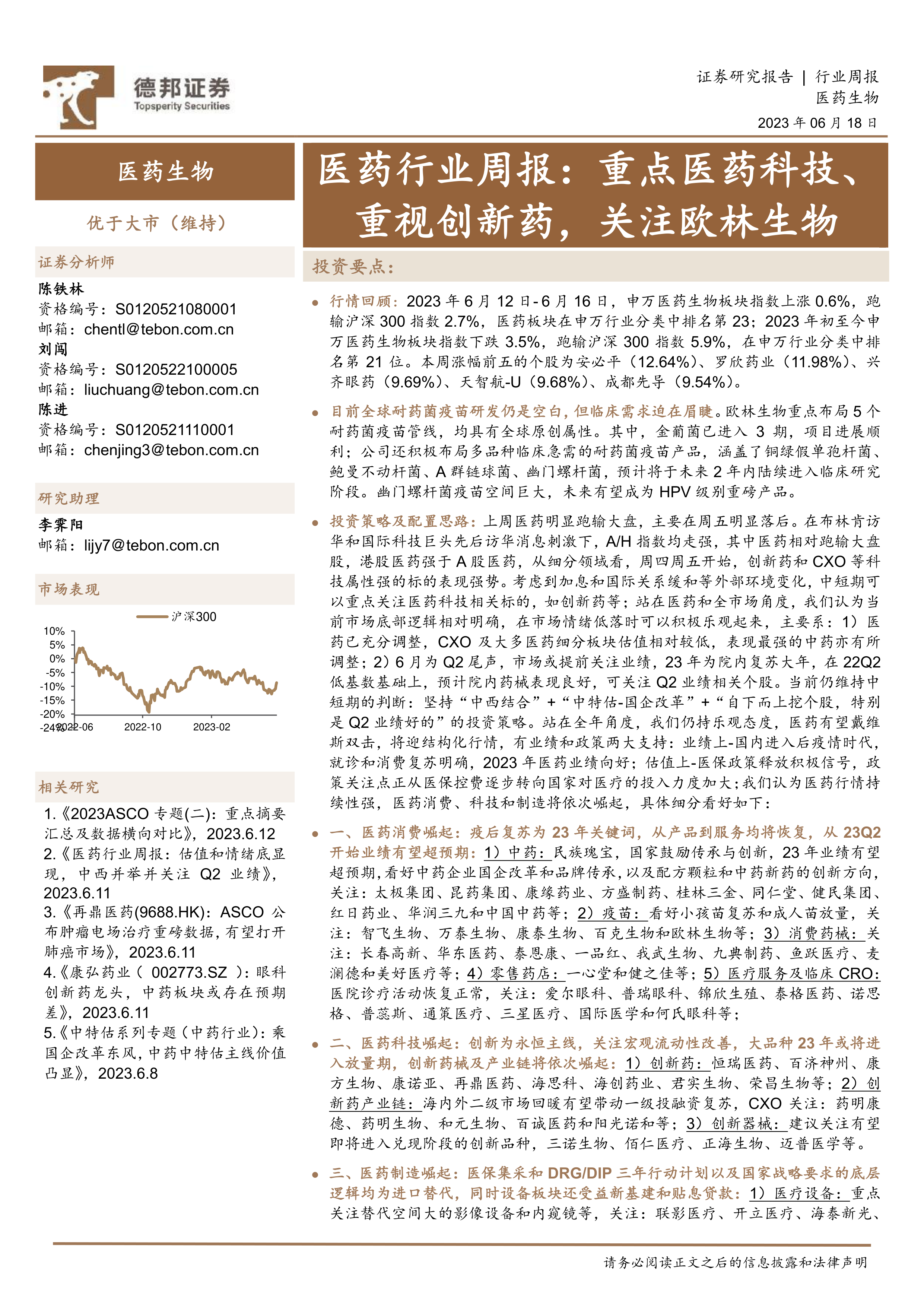 本报告的核心观点是:医药行业在经历充分调整后,底部逻辑相对明确,未来有望迎来结构化行情,实现戴维斯双击。投资策略应坚持“中西结合”+“中特估-国企改革”+“自下而上挖个股,特别是Q2业绩好的”的策略。具体而言,看好医药消费、医药科技和医药制造三大领域的崛起,并重点关注创新药、CXO、耐药菌疫苗等细分领域。