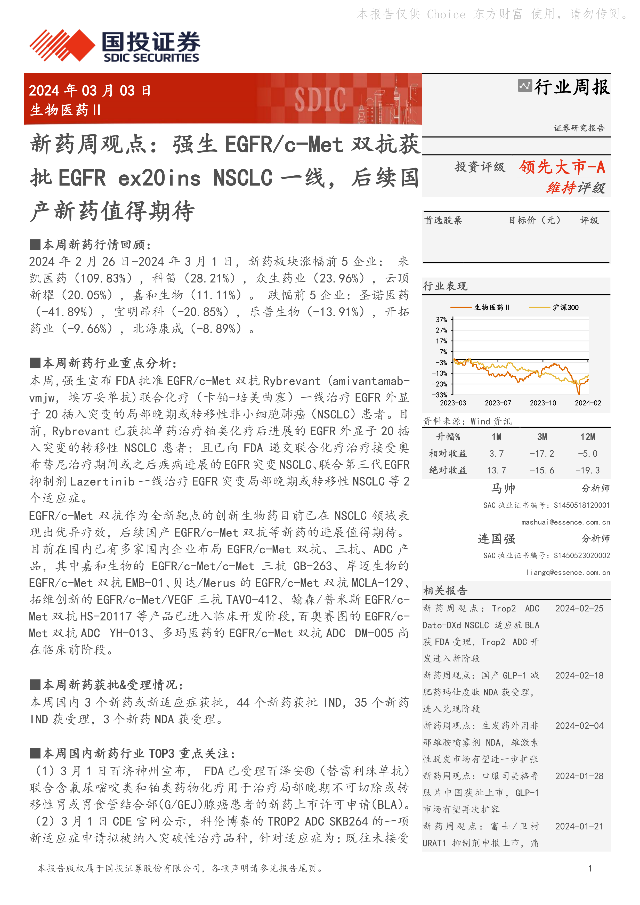 本报告的核心观点是:强生EGFR/c-Met双抗Rybrevant获批一线治疗EGFR外显子20插入突变的非小细胞肺癌(NSCLC),标志着该靶点创新生物药在NSCLC领域取得重大突破,也为国内同类药物研发提供了积极信号。报告同时分析了国内外新药研发动态,并对本周重点新药及行业发展趋势进行了专业解读。