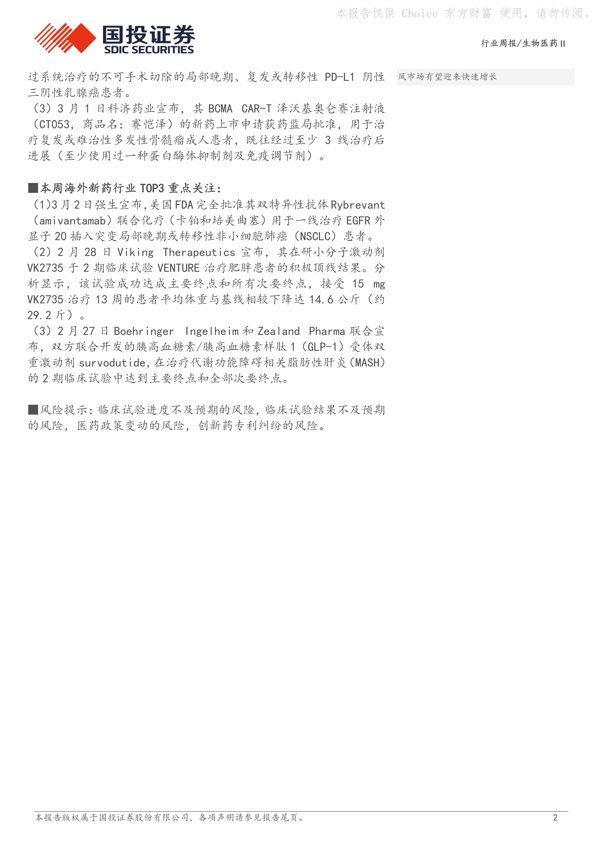 本周海外新药行业重点关注事件包括:强生Rybrevant获批;Viking Therapeutics肥胖症治疗药物VK2735二期临床试验结果积极;Boehringer Ingelheim和Zealand Pharma联合开发的GLP-1受体双重激动剂survodutide二期临床试验达到主要终点。报告对这些事件进行了详细解读,并分析了其对相关企业及行业的影响。 此外,报告还提及了其他一些海外新药研发进展,例如Cardiff Oncology的onvansertib、Vivani Medical的NPM-115等,并对这些药物的临床数据和研发进展进行了简要介绍。