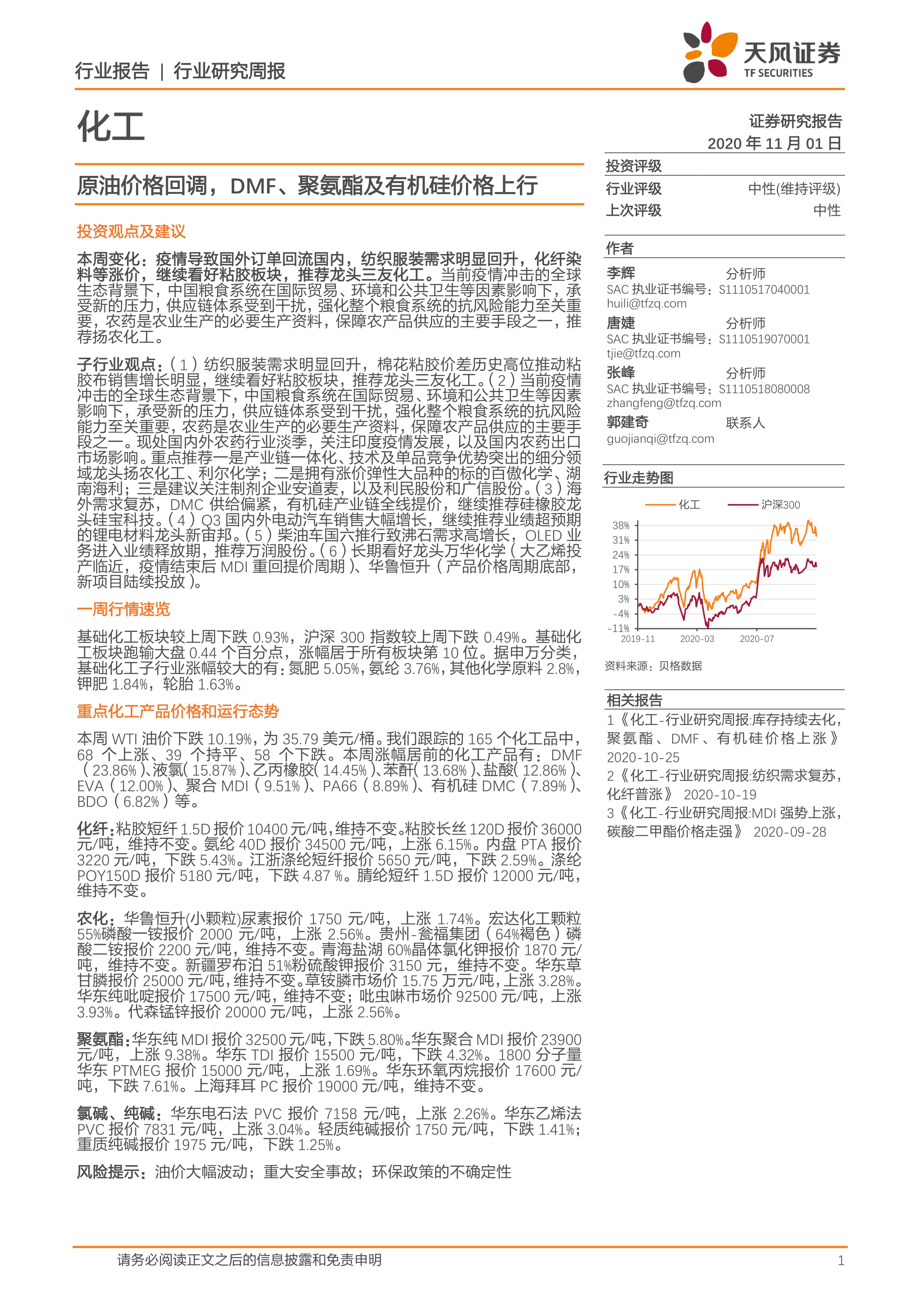 本报告的核心观点是:基于2020年11月1日的数据,原油价格回调,DMF、聚氨酯及有机硅价格上行,化工行业整体评级为中性。报告重点关注了化纤、农化、聚氨酯等子行业,并推荐了部分个股,例如三友化工、扬农化工、硅宝科技、新宙邦、万润股份、万华化学和华鲁恒升等。 报告同时分析了宏观经济环境对化工行业的影响,以及部分化工产品的价格波动情况。