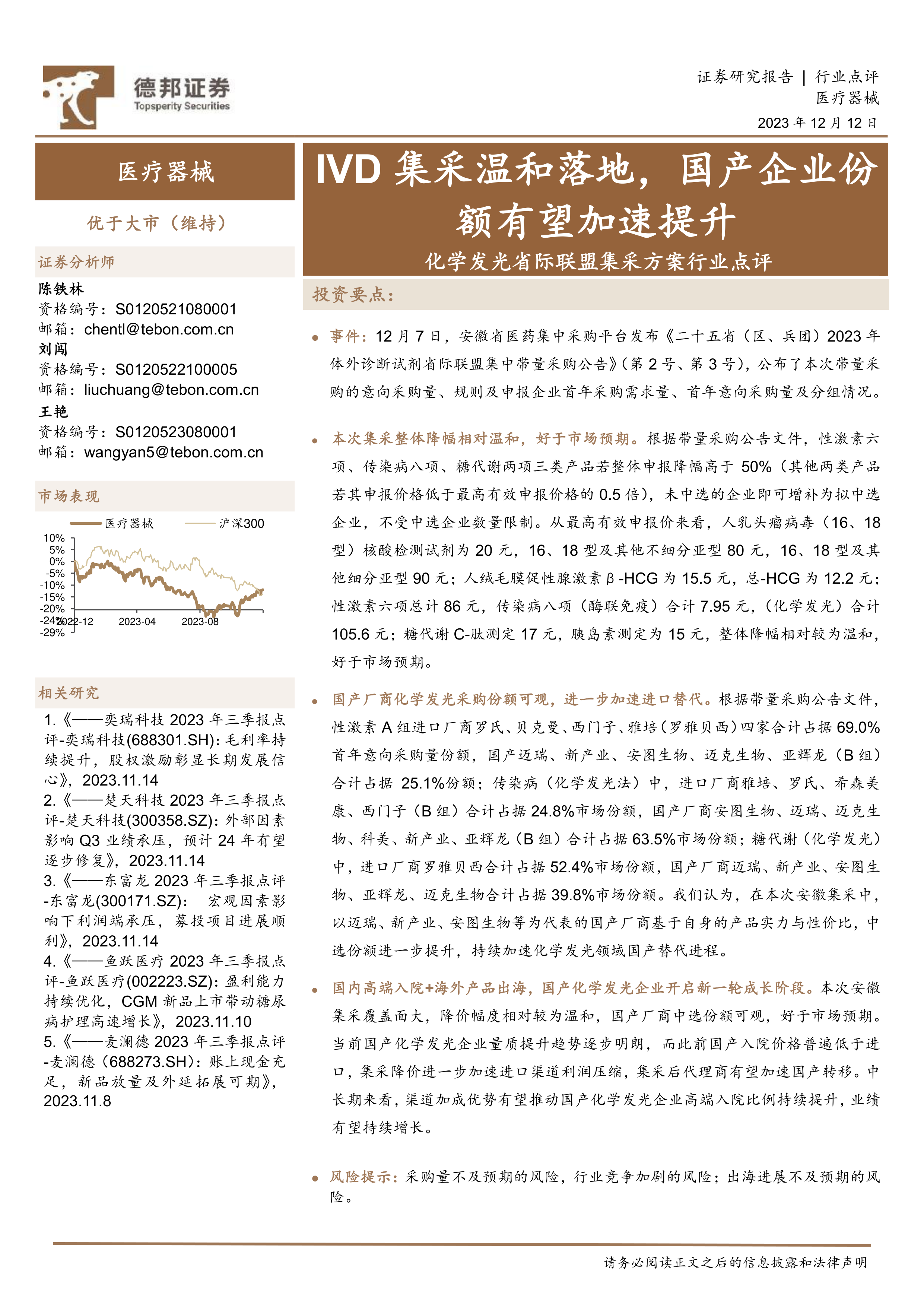 本报告的核心观点是:2023年12月7日发布的二十五省(区、兵团)2023年体外诊断试剂省际联盟集中带量采购结果显示,集采降价幅度相对温和,好于市场预期。国产化学发光企业凭借性价比优势,中选份额显著提升,加速了进口替代进程,并有望在高端市场进一步扩张。