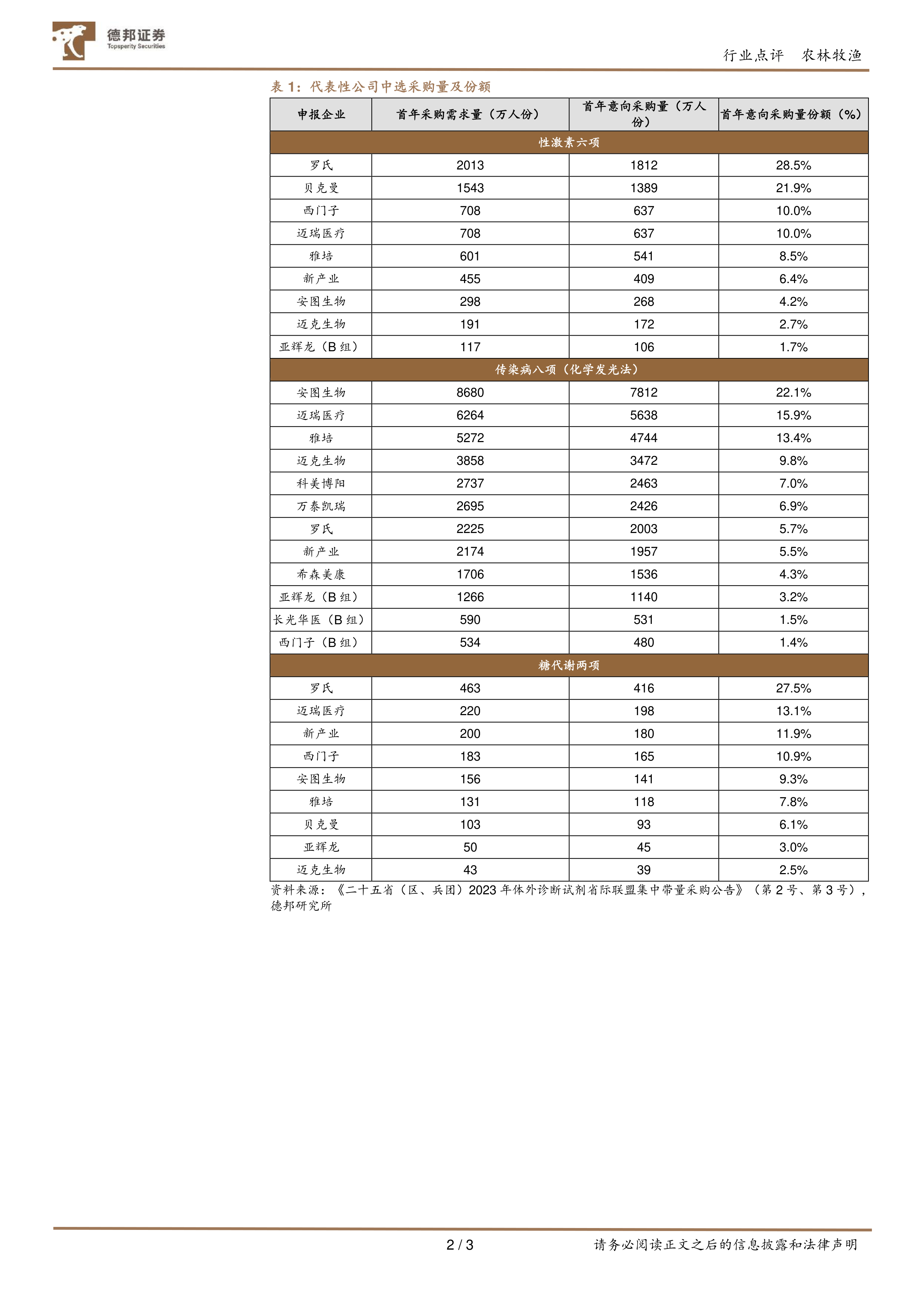 事件:12月7日,安徽省医药集中采购平台发布《二十五省(区、兵团)2023年体外诊断试剂省际联盟集中带量采购公告》(第2号、第3号),公布了本次带量采购的意向采购量、规则及申报企业首年采购需求量、首年意向采购量及分组情况。