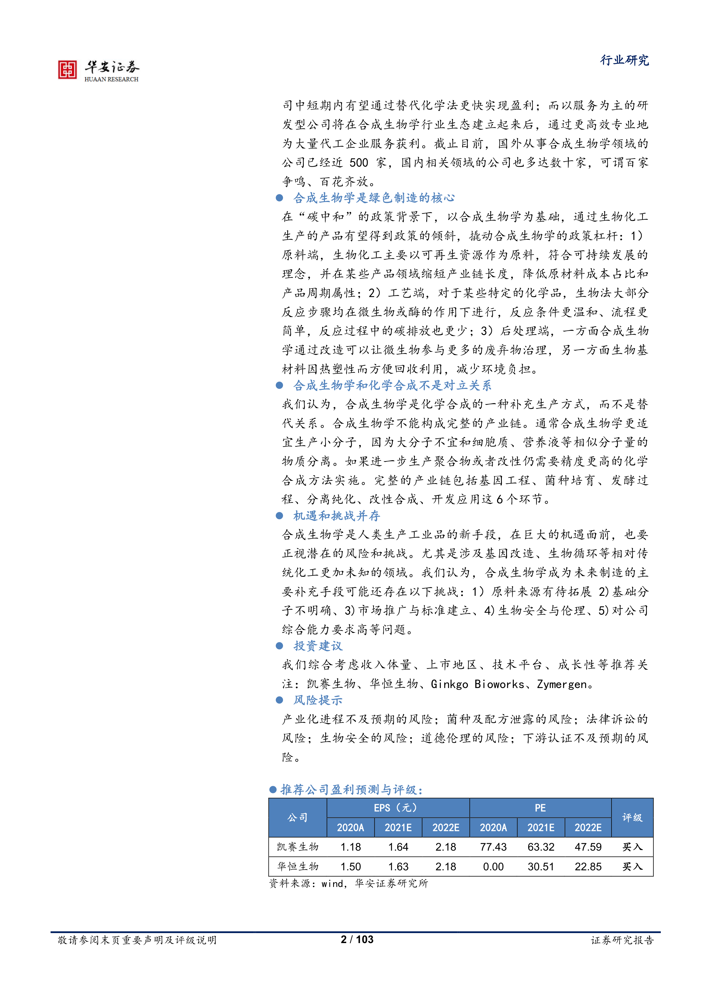 有一个角度可以观察一个产业的发展阶段,那就是产业中大部分企业的融资方式。如果全部企业都是通过一级市场融资,说明产业处于导入期;如果开始有企业陆续上市,在二级市场融资,说明产业进入成长期;如果大量企业上市层出不穷,说明产业进入快速成长期。例如,电动车产业的发展主要看特斯拉的上市,以及 2018 年单季度盈利转正,随之而来的是整个产业的两次大爆发。对比合成生物学产业,全球主要有 5家上市公司,近一年内集中上市 4家公司,分别是凯赛生物、华恒生物、 Zymergen、 Ginkgo Bioworks。我们华安化工认为,合成生物学领域多家公司集中上市代表这一领域已进入成长期。