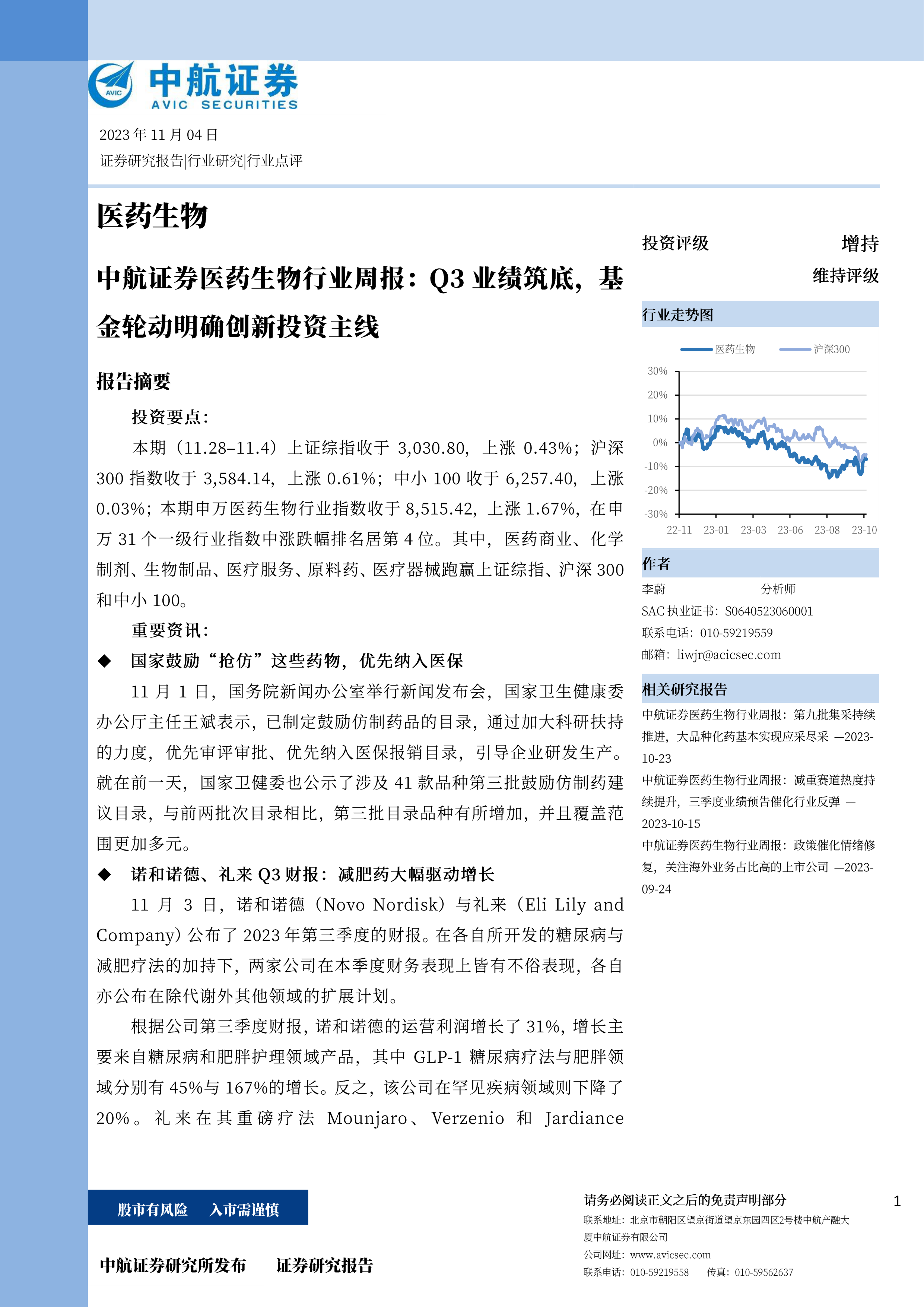 医药生物行业周报:Q3业绩筑底,基金轮动明确创新投资主线