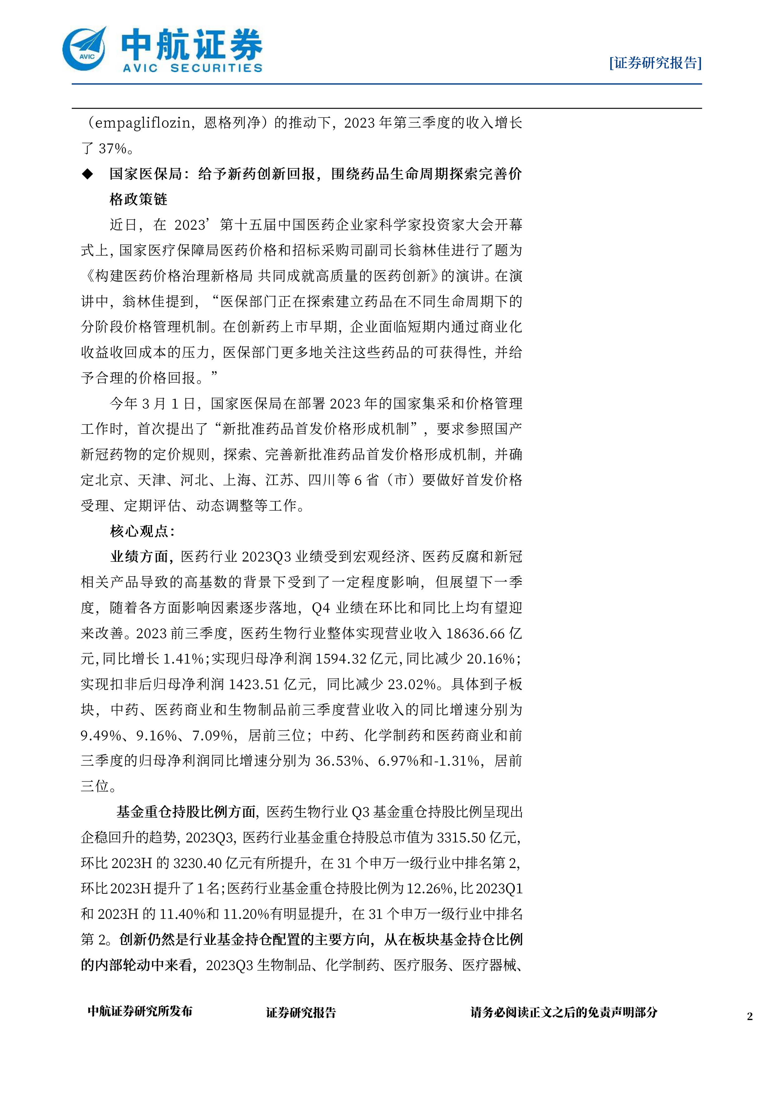 基金重仓持股比例方面医药生物行业Q3基金重仓持股比例呈现出企稳回升的趋势,202303,医药行业基金重仓持股总市值为3315.50亿元环比2023H的3230.40亿元有所提升,在31个中万一级行业中排名第2环比2023H提升了1名;医药行业基金重仓持股比例为12.26%,比2023Q1和2023H的11.40%和11.20%有明显提升,在31个申万一级行业中排名第2。创新仍然是行业基金持仓配置的主要方向,从在板块基金持仓比例的内部轮动中来看,202303生物制品、化学制药、医疗服务、医疗器械