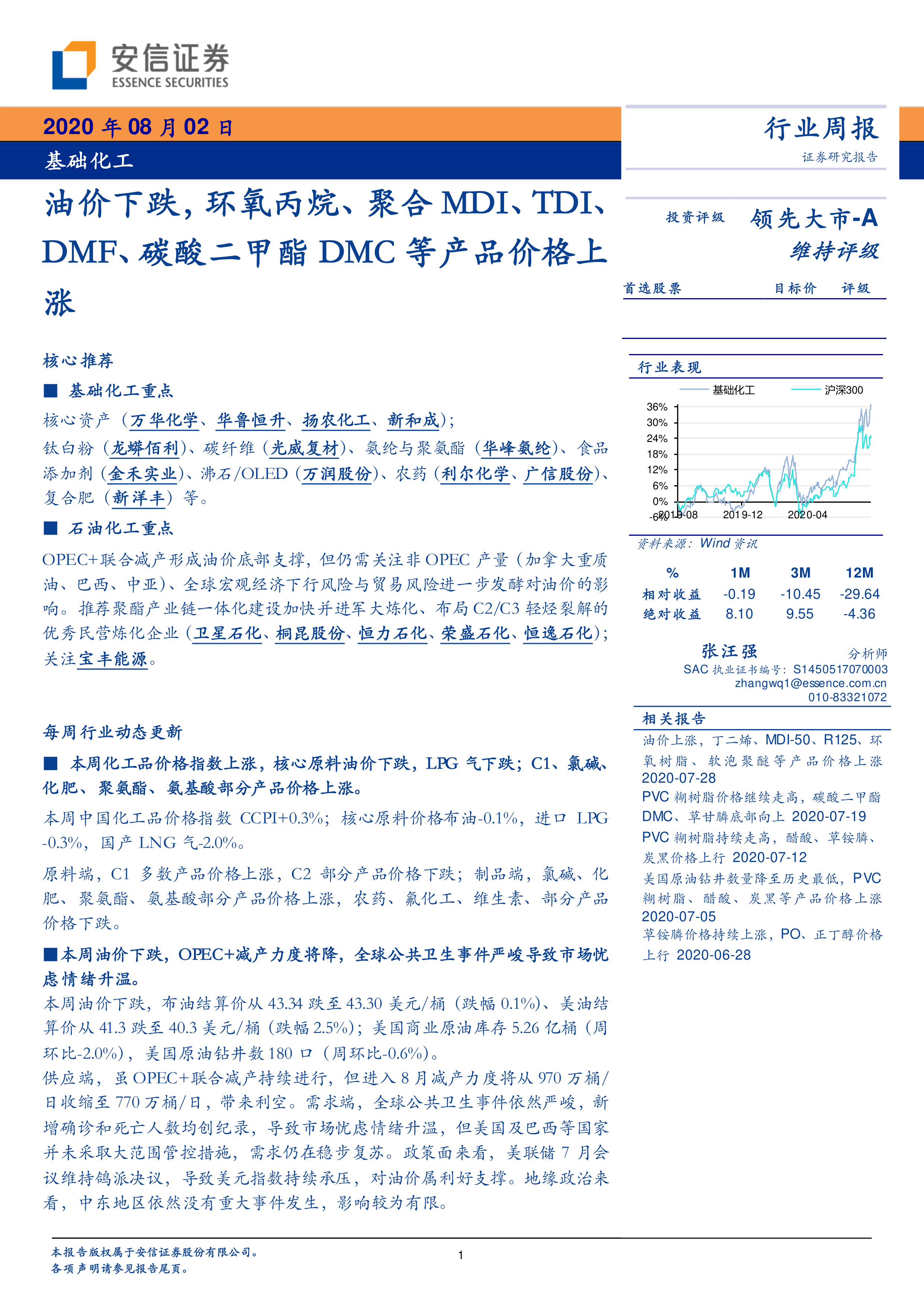 本报告的核心观点是:2020年8月2日,基础化工行业整体表现领先大市,部分产品价格上涨,主要受油价下跌、下游需求改善以及部分生产装置检修等因素影响。 具体而言,报告分析了油价波动对基础化工产品价格的影响,并重点关注了环氧丙烷、聚合MDI、TDI、DMF、碳酸二甲酯DMC等产品的价格走势及驱动因素。