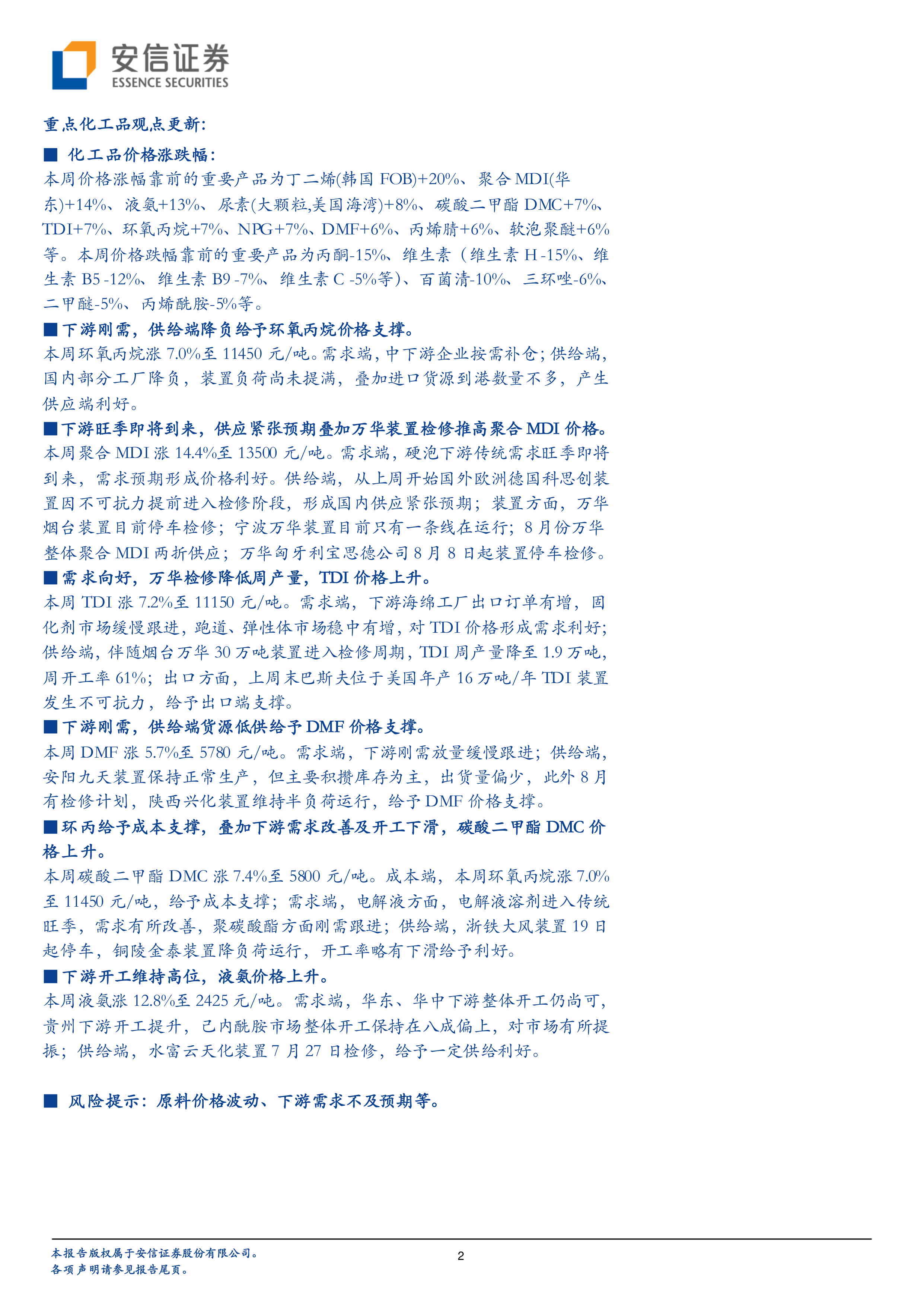 本周聚合 MDI 涨 14.4%至 13500 元/吨。需求端, 硬泡下游传统需求旺季即将到来, 需求预期形成价格利好。 供给端, 从上周开始国外欧洲德国科思创装置因不可抗力提前进入检修阶段, 形成国内供应紧张预期; 装置方面, 万华烟台装置目前停车检修;宁波万华装置目前只有一条线在运行; 8 月份万华整体聚合 MDI 两折供应; 万华匈牙利宝思德公司 8 月 8 日起装置停车检修。