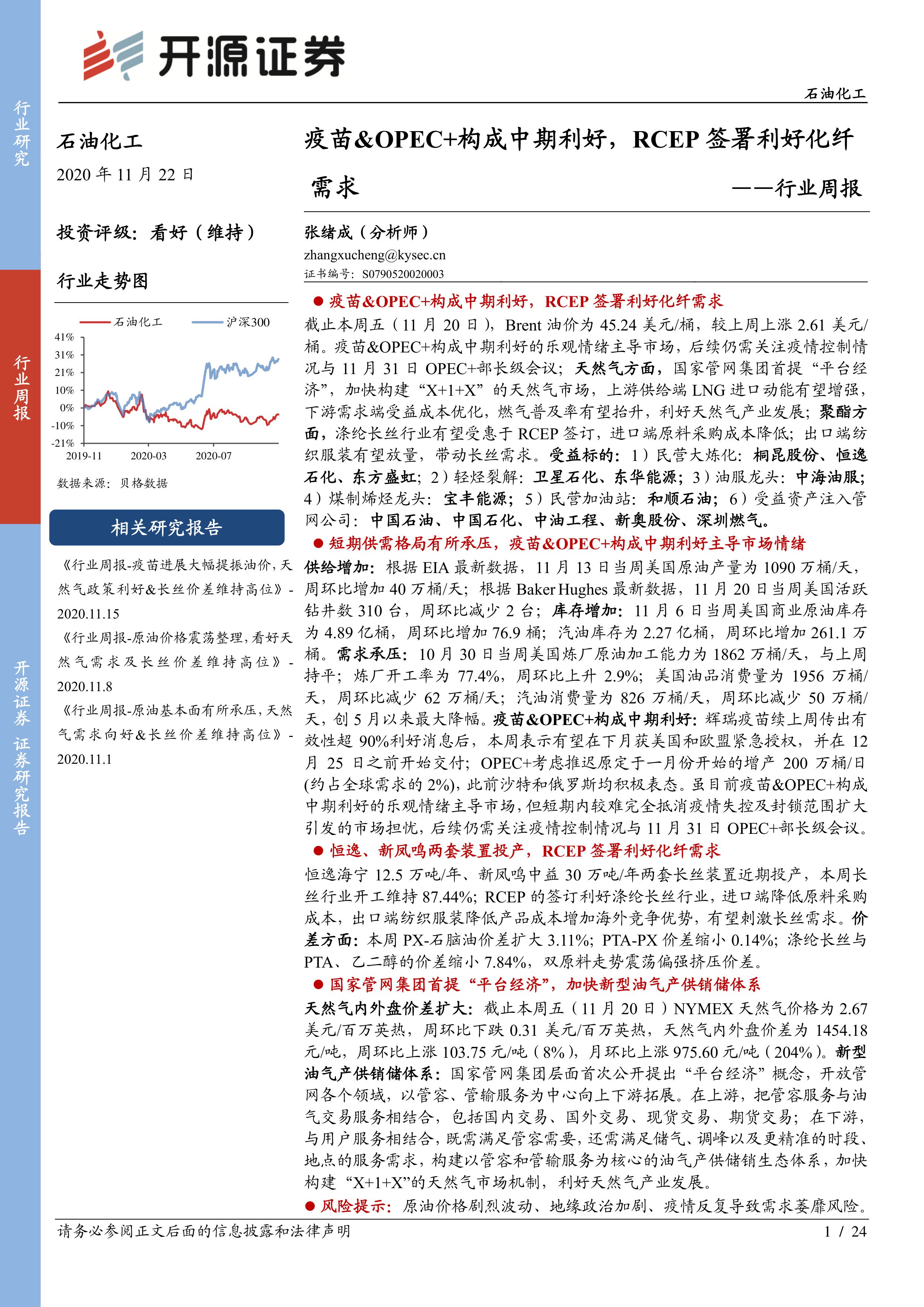 石油化工行业周报:疫苗&OPEC+构成中期利好,RCEP签署利好化纤需求