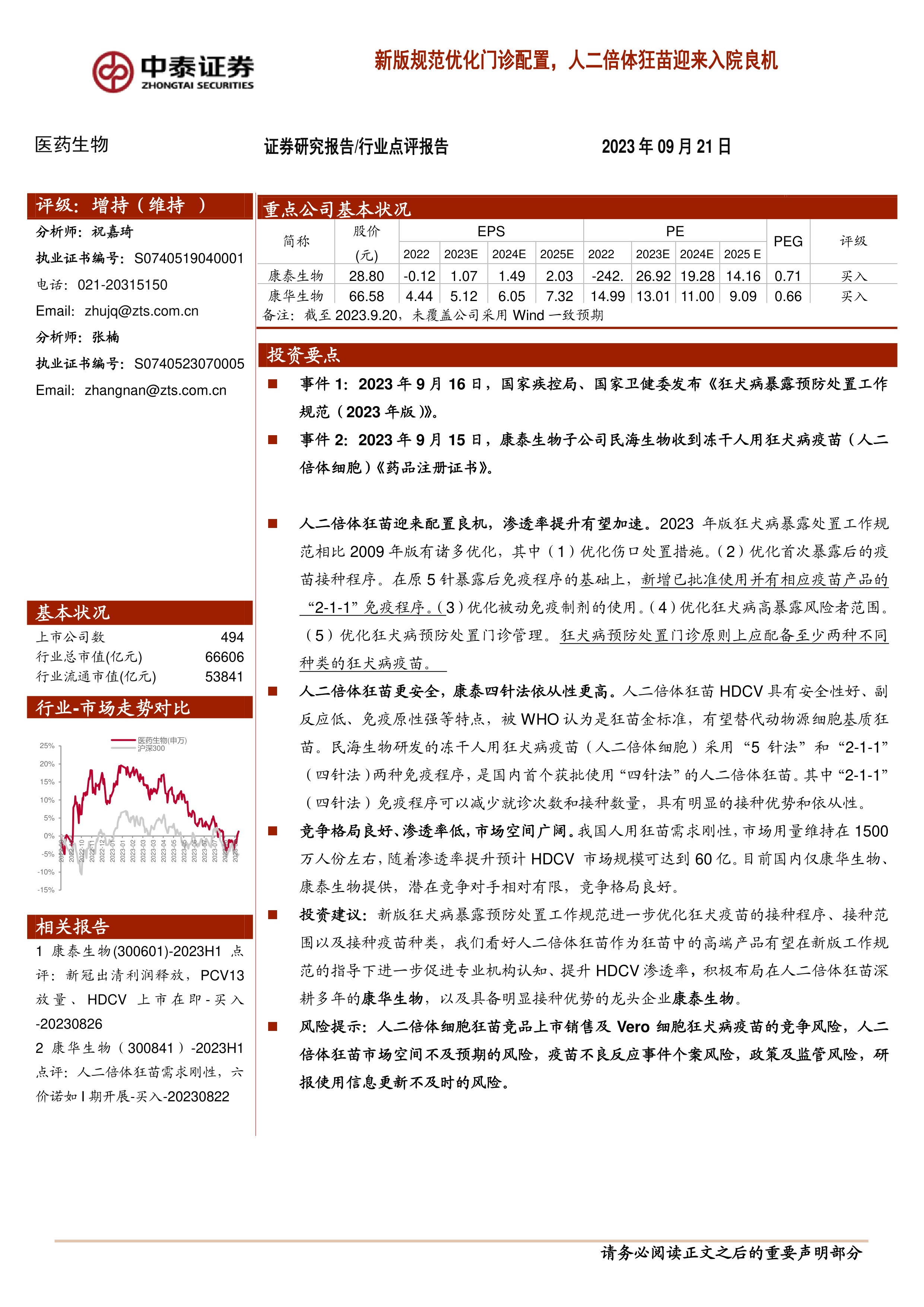 本报告的核心观点是:2023年版《狂犬病暴露预防处置工作规范》的发布以及康泰生物子公司民海生物获得冻干人用狂犬病疫苗(人二倍体细胞)注册证书,为国内人二倍体狂犬病疫苗(HDCV)市场带来了重大机遇。新规范优化了门诊配置和疫苗接种程序,提升了HDCV的市场竞争力,预计将加速其渗透率提升,从而扩大市场规模。康泰生物和康华生物作为国内主要生产商,有望受益于这一市场趋势。