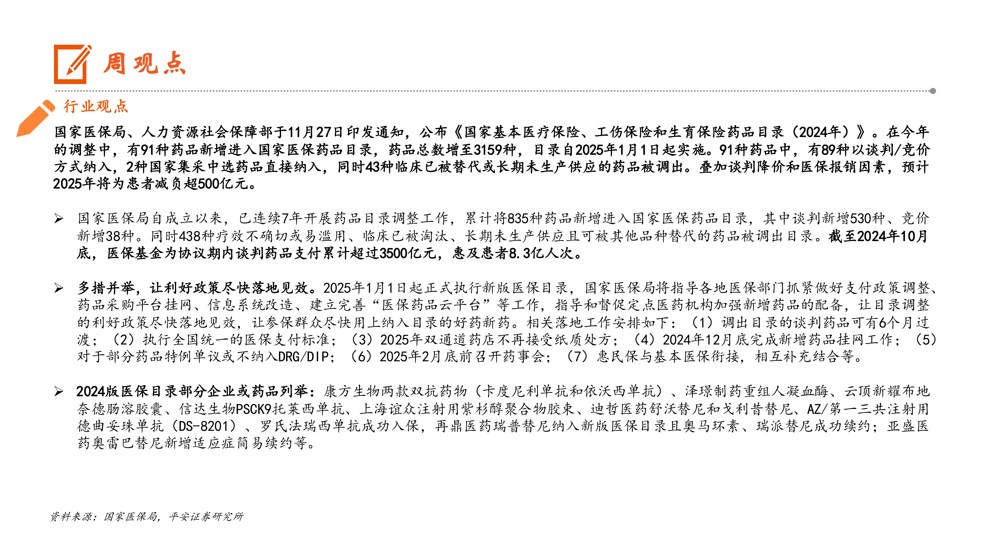 本报告的核心观点是:2024年版国家医保目录的公布对生物医药行业发展具有积极意义,尤其利好创新药企。医保目录新增91种药品,其中大部分为谈判/竞价进入,体现了国家对创新药发展的支持力度。 同时,报告分析了GLP-1多肽产业链的广阔空间,以及国内医药行业面临的“复苏”、“出海”、“创新”三大机遇,并推荐了一系列值得关注的公司。