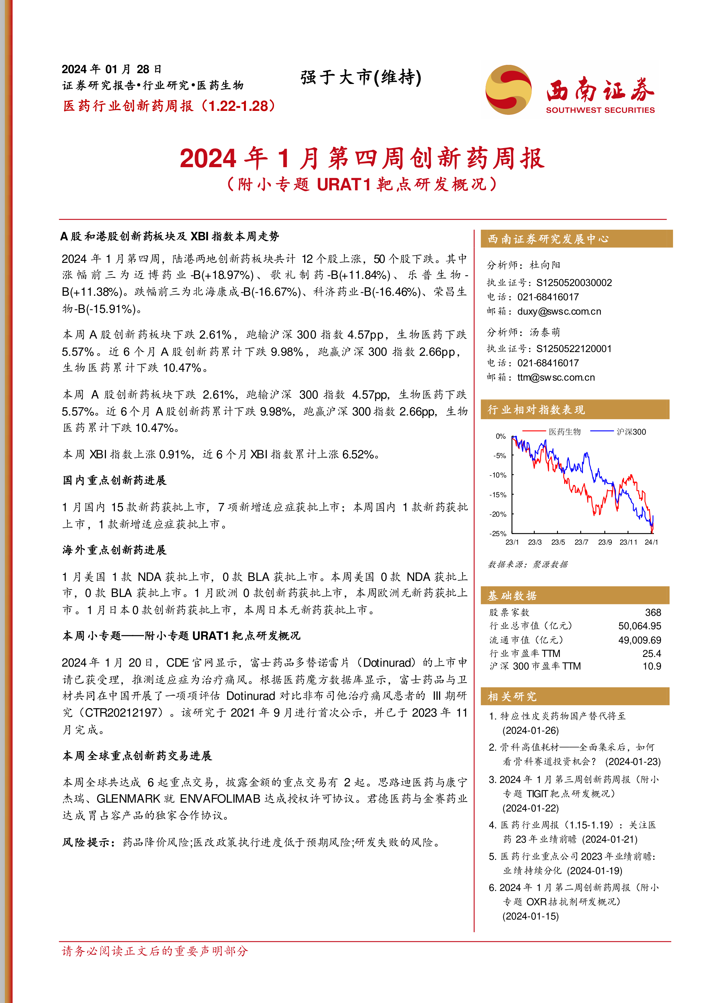 医药行业创新药周报:2024年1月第四周创新药周报(附小专题URAT1靶点研发概况)