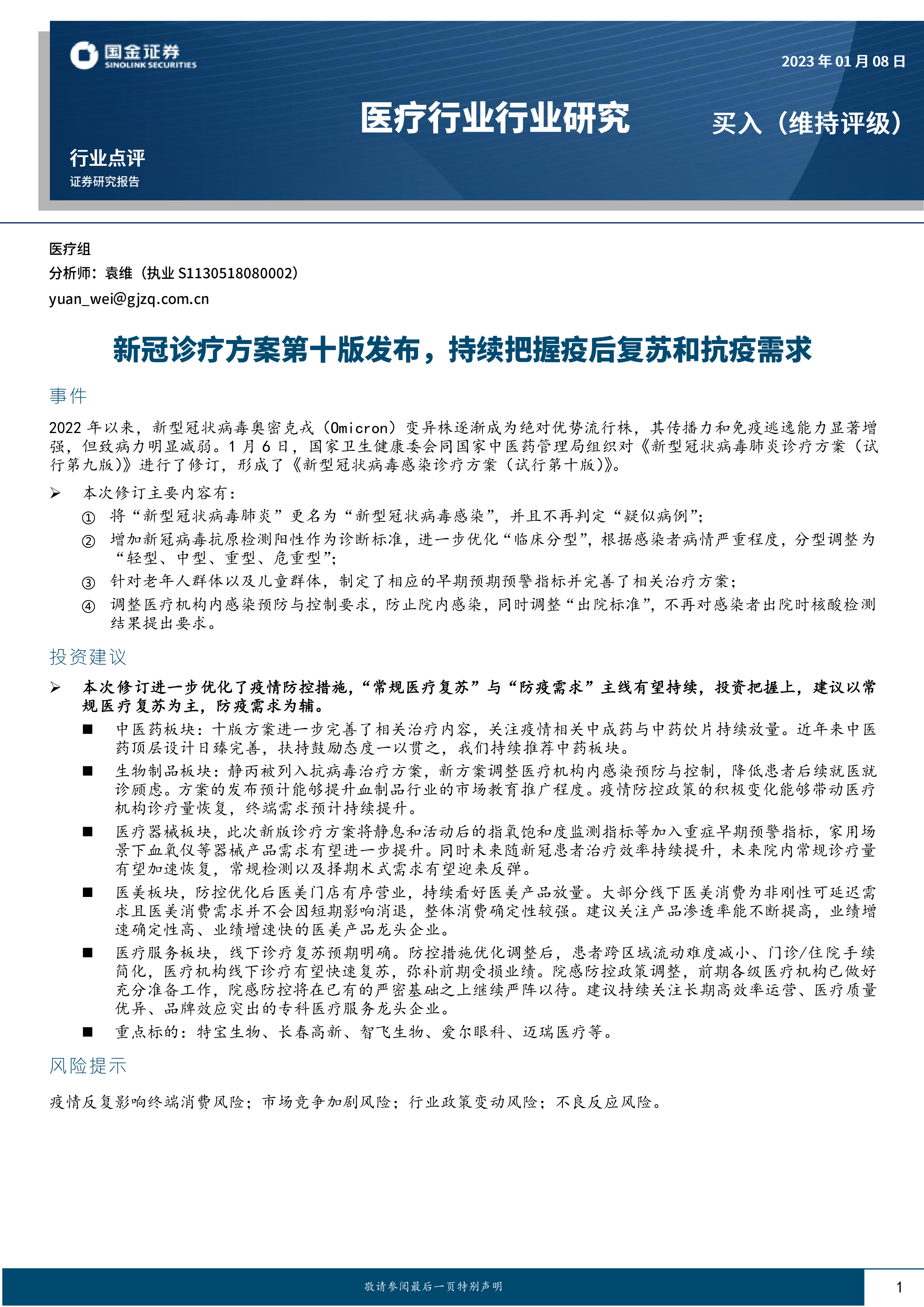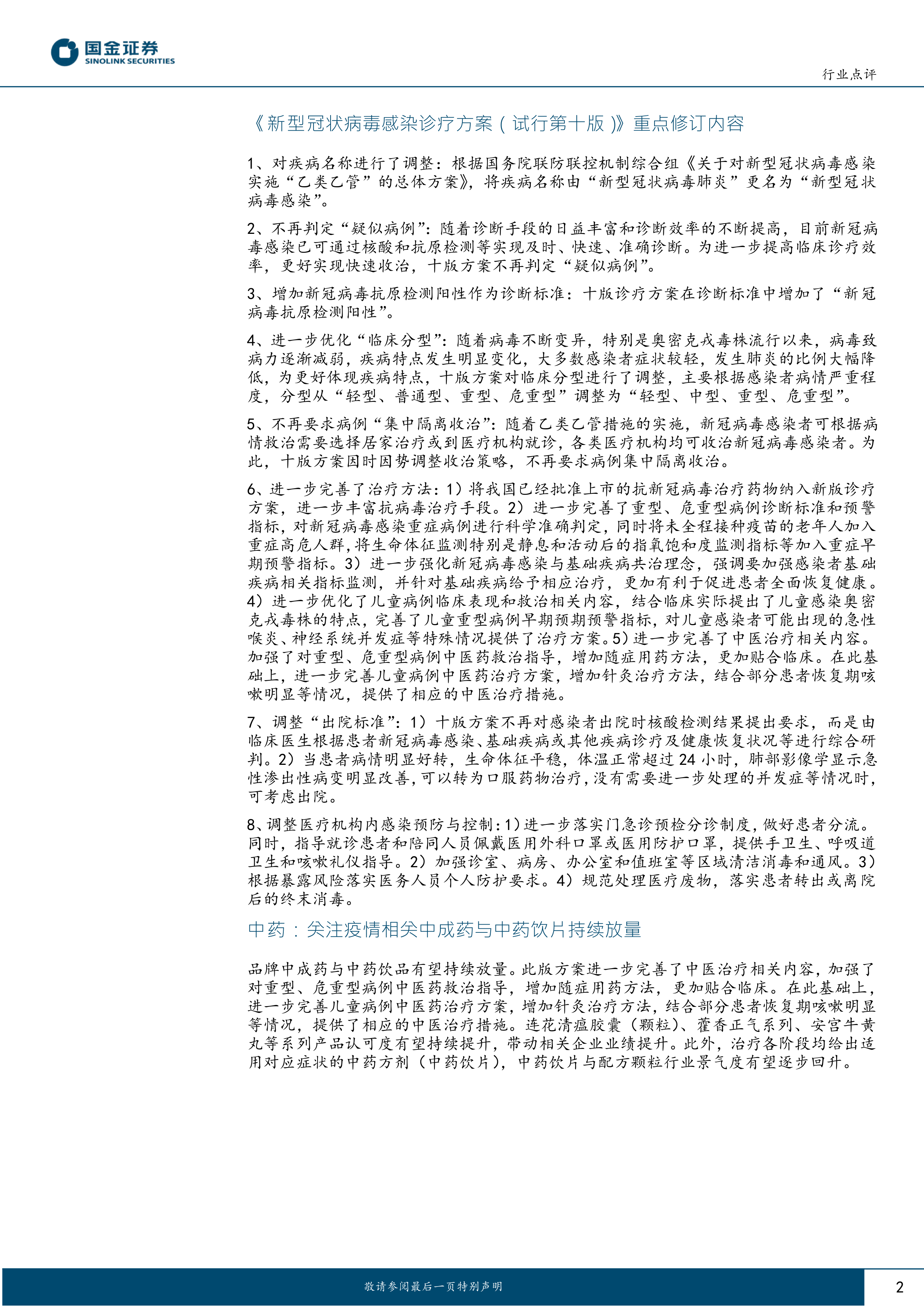 本报告的核心观点是:新型冠状病毒感染诊疗方案(试行第十版)的发布,标志着我国新冠疫情防控政策进一步优化,常规医疗服务有望加速复苏。“常规医疗复苏”和“防疫需求”将成为未来医疗行业投资的两大主线,建议投资者以常规医疗复苏为主,防疫需求为辅。具体而言,中药、生物制品、医疗器械、医美和医疗服务等板块都将受益于政策调整,但风险也依然存在。