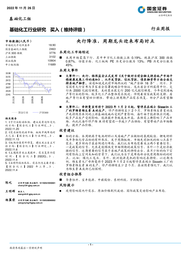 标的方面,本周钠离子电池材料以及房地产产业链标的表现较佳,锂电材料及半导体化学品标的有所承压。关于周期板块,市场先前担忧的核心点在于需求,更多倾向于在右侧进行布局,我们认为布局需要关注两个重要信号,一是政策的信号,尤其是能够改变市场预期的政策信号,另外一个是经济数据的信号,近期重要的信号在于房地产政策的持续出台,在不少标的向下空间有限向上空间未知的背景下,我们认为当下是布局部分优质周期标的的时点,比如:煤化工龙头。另外,欧洲能源危机的影响还在持续,以近期为例,维生素大厂帝斯曼将于2023年1月2日起暂停其在瑞士Sisseln工厂的罗维素维生素A的生产,停产将持续至少2个月,在该因素催化下,我们认为维生素A底部已经探明。