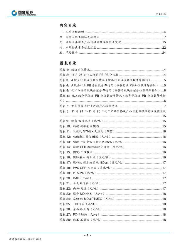 本节详细分析了国金证券对轮胎、金禾实业、浙江龙盛、胜华新材、钛白粉、新和成、神马股份、万华化学、合盛硅业、新安股份、滨化股份、永太科技、多氟多、天赐材料、新宙邦、远兴能源、中盐化工、扬农化工、广信股份、沧州大化、康达新材、华鲁恒升、龙蟠科技、宝丰能源等重点化工企业的近期观点,并对这些企业所属子行业的产品价格走势、供需关系、成本变化以及未来发展前景进行了深入分析。 分析内容涵盖了产品价格波动、市场供需、成本变化、政策影响等多个方面,并结合图表7对重点覆盖子行业的近期产品跟踪情况进行了总结。