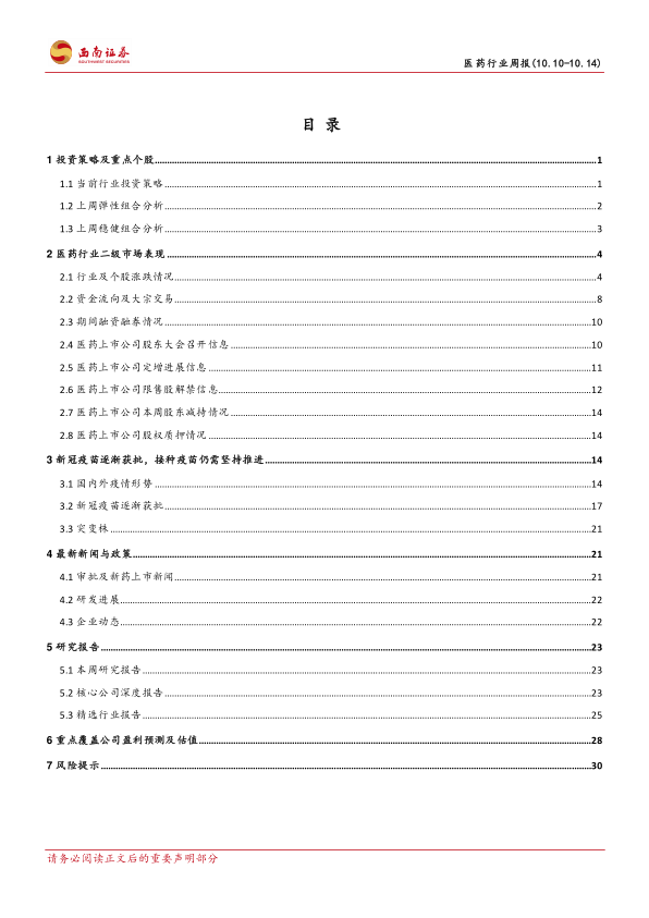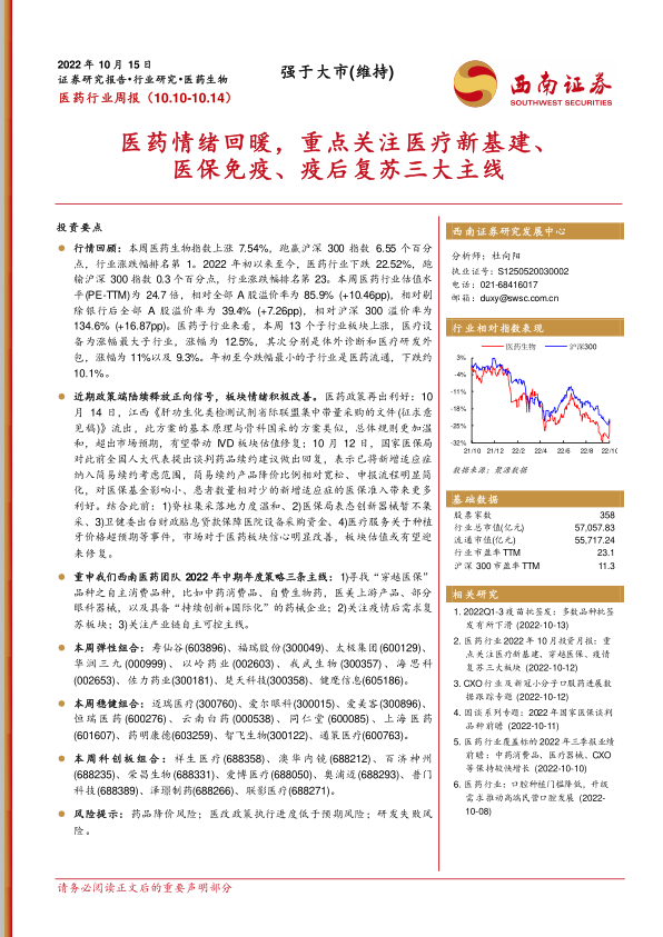 本报告对2022年10月10日至10月14日一周的医药行业市场进行了全面分析。本周医药行业强势反弹,主要受近期政策利好及市场情绪改善驱动。报告建议投资者关注“穿越医保”的自主消费品种、疫情后需求复苏板块以及产业链自主可控主线,并提供了相应的投资组合建议。 报告还详细分析了医药行业二级市场表现、新冠疫苗进展、最新政策及市场动态,以及对重点公司进行了盈利预测和估值分析,为投资者提供了全面的市场信息和投资参考。 然而,投资者仍需注意药品降价风险、医改政策执行进度低于预期风险以及研发失败风险等潜在风险。