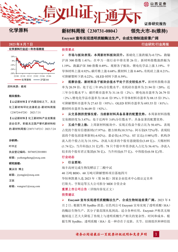 本报告基于山西证券研究所提供的化学原料新材料周报数据,对新材料行业进行了全面分析。报告指出,新材料行业长期发展前景向好,但短期内也面临原材料价格波动、政策变化以及行业竞争加剧等风险。Enzymit公司在透明质酸酶法生产上的突破为合成生物制造技术提供了新的发展方向,值得关注国内相关企业的投资机会。同时,报告也提示投资者关注新材料板块的估值水平和交易拥挤度,把握良好的配置窗口。 报告中提供的宏观经济数据、中观产业数据以及微观公司数据,为投资者进行投资决策提供了重要的参考依据。 需要注意的是,投资有风险,投资者需谨慎决策。