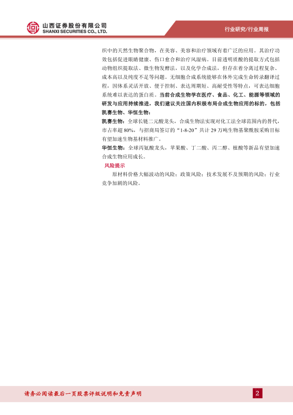 凯赛生物: 全球长链二元酸龙头, 合成生物法实现对化工法全球范围内的替代,市占率超 80%, 与招商局签订的“1-8-20” 共计 29 万吨生物基聚酰胺采购目标有望加速生物基材料推广。