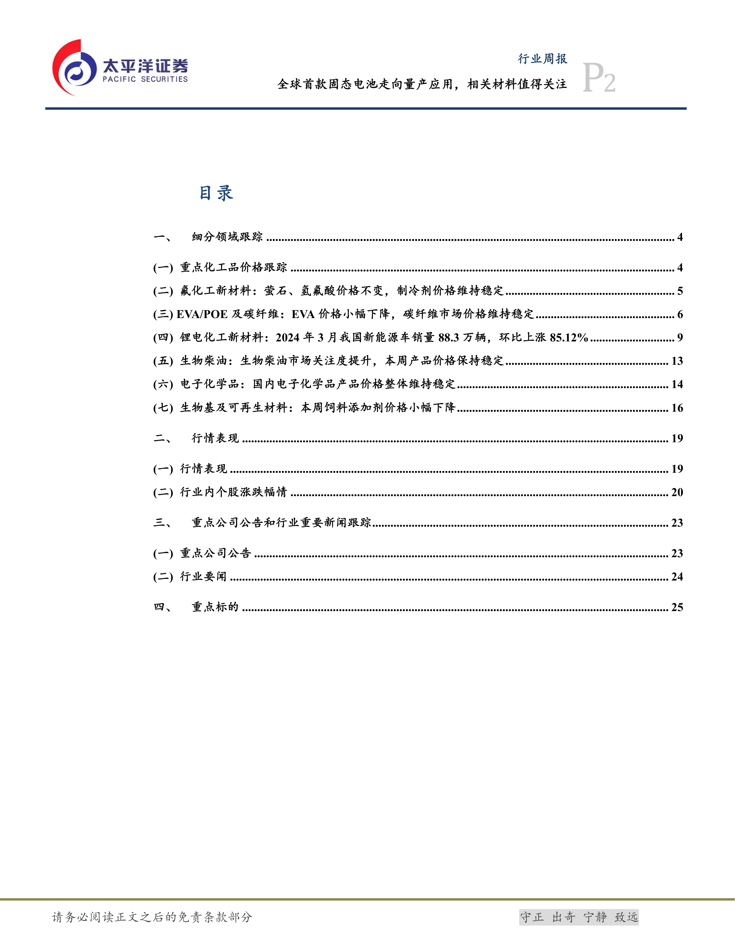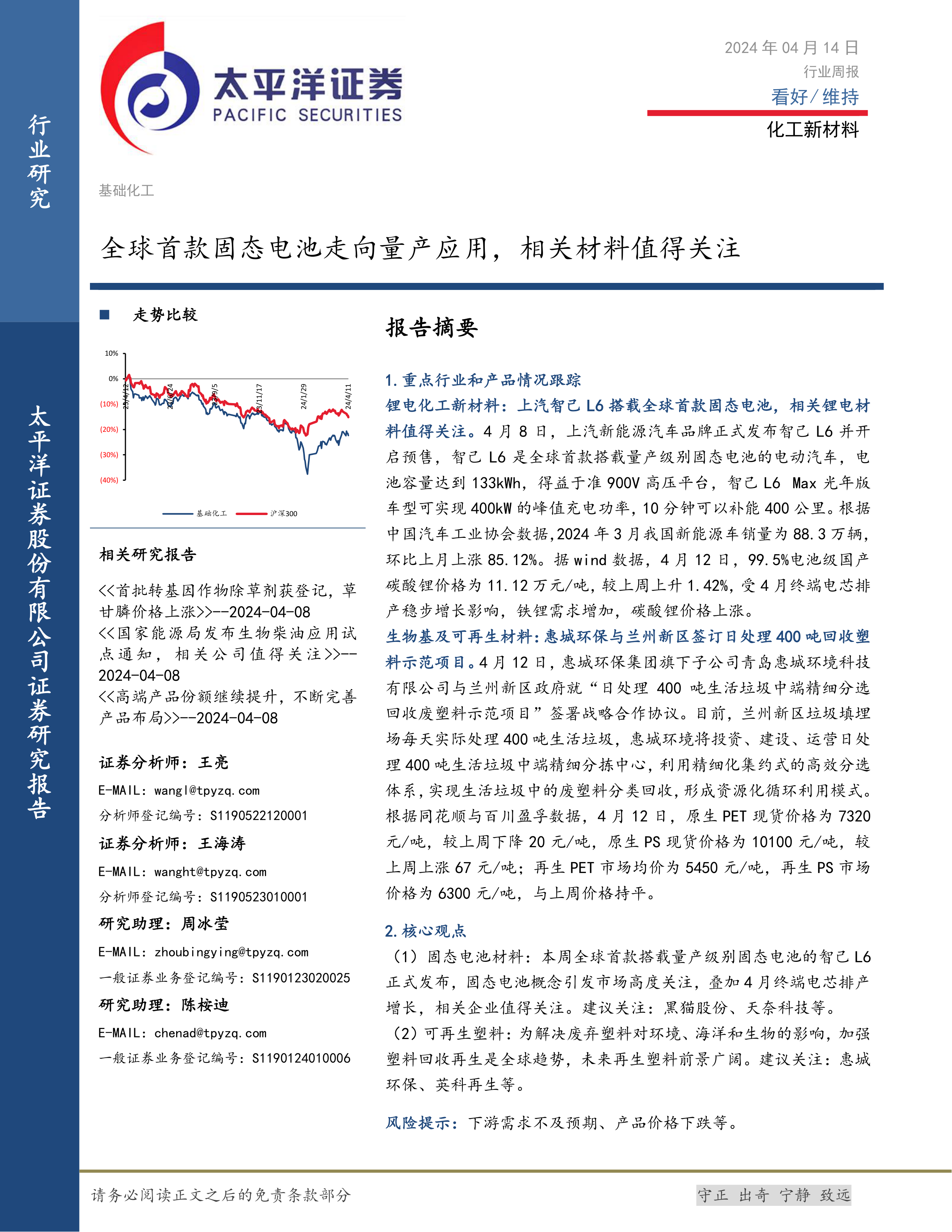 本报告基于公开数据对2024年4月12日一周的化工新材料行业进行了全面分析。报告指出,固态电池材料和可再生塑料是值得关注的两个重点领域,其市场前景广阔。同时,报告也提示了化工行业整体表现分化,下游需求和产品价格波动是影响行业发展的重要因素。 报告中对多个细分领域的价格走势、市场供需情况以及重点公司动态进行了详细分析,为投资者提供了有价值的参考信息。 需要注意的是,报告中提到的投资建议仅供参考,不构成投资建议,投资者需谨慎决策,并自行承担投资风险。