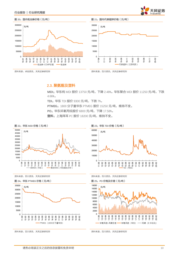 MDI、TDI、环氧丙烷价格下跌,而PTMEG和PC价格维持不变,显示聚氨酯及塑料行业受到市场需求和原油价格波动的影响。