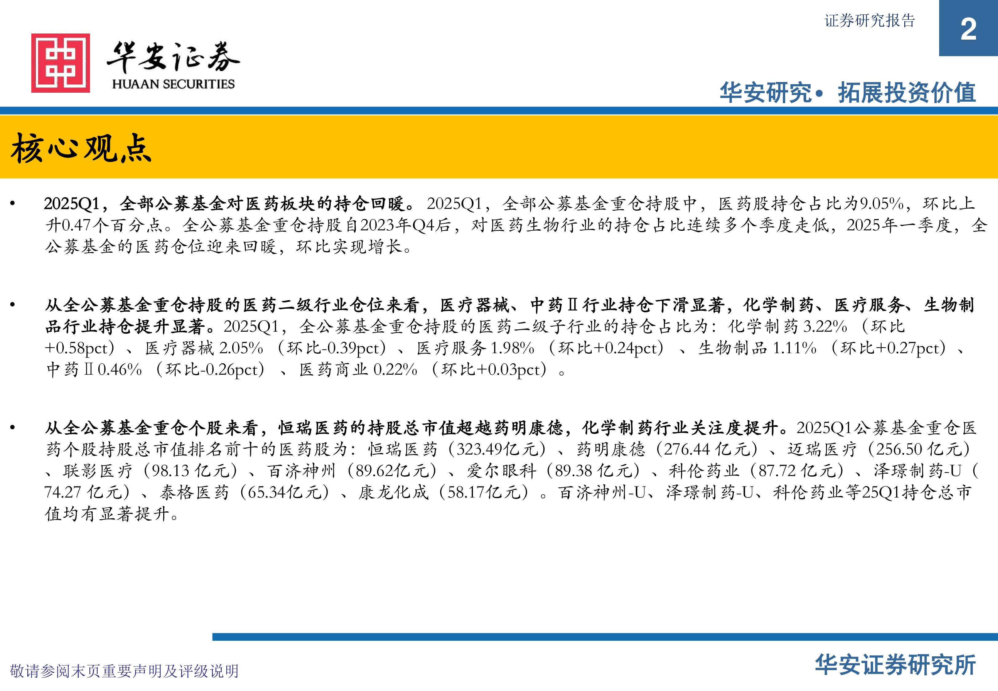 本报告的核心观点是:2025年第一季度,公募基金对医药板块的持仓出现回暖,整体持仓占比环比上升。 具体而言,化学制药板块增幅显著,而医疗器械和中药板块则有所下降。个股方面,恒瑞医药超越药明康德成为公募基金重仓持股总市值最高的医药股,部分个股的持股市值和持股数量均出现大幅波动。