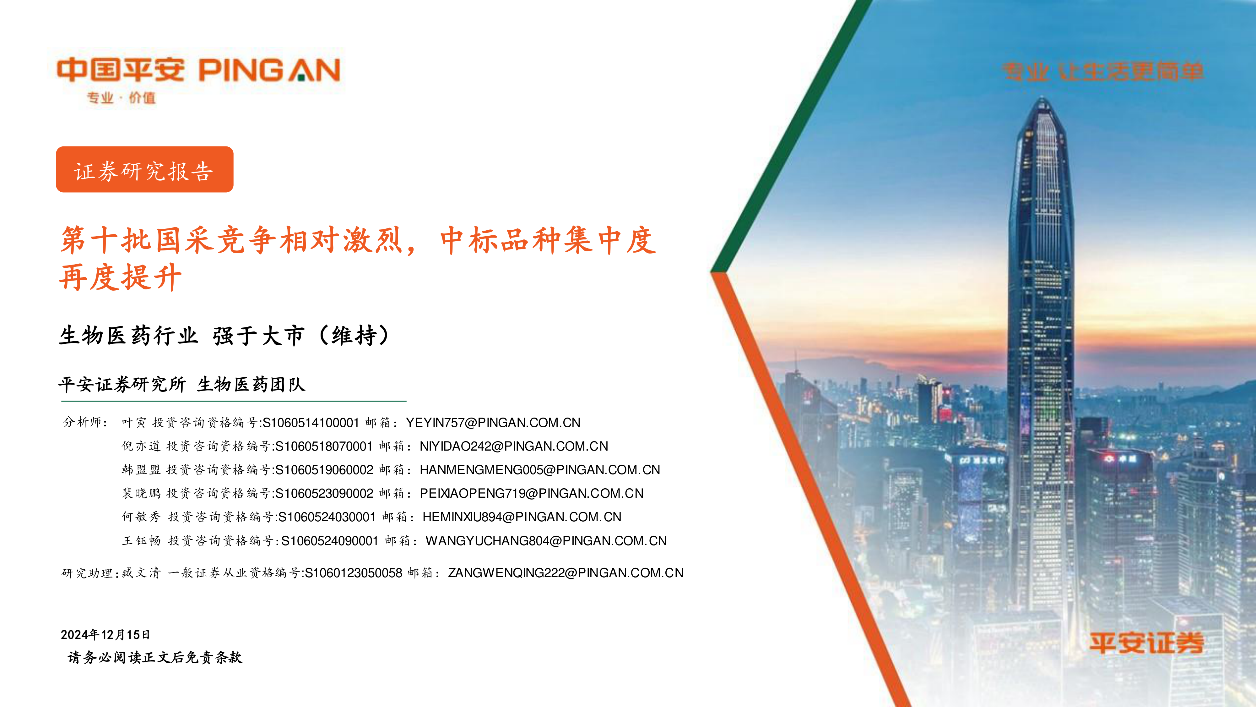 本报告基于第十批国采结果及行业发展趋势,分析了医药行业市场竞争格局的变化,并提出了相应的投资策略建议。第十批国采竞争激烈,中标品种集中度提升,头部仿制药企业受益。未来,创新、出海、设备更新和消费复苏将成为医药行业的重要发展方向,投资者应关注具备核心竞争力的企业。 报告同时提示了投资风险,建议投资者谨慎决策。 报告中提供的公司信息和投资建议仅供参考,不构成投资建议。