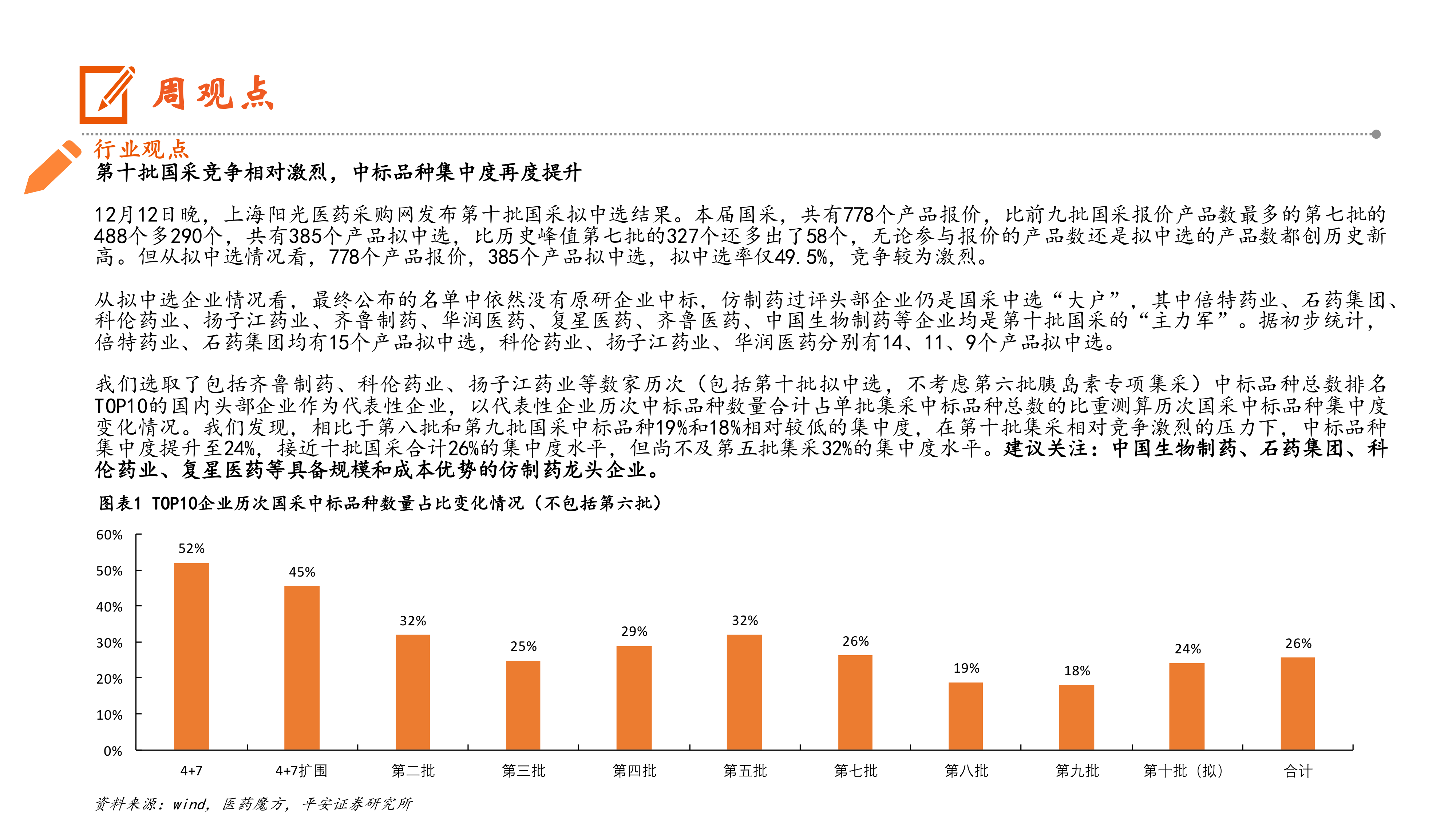 生物医药行业:第十批国采竞争相对激烈,中标品种集中度再度提升