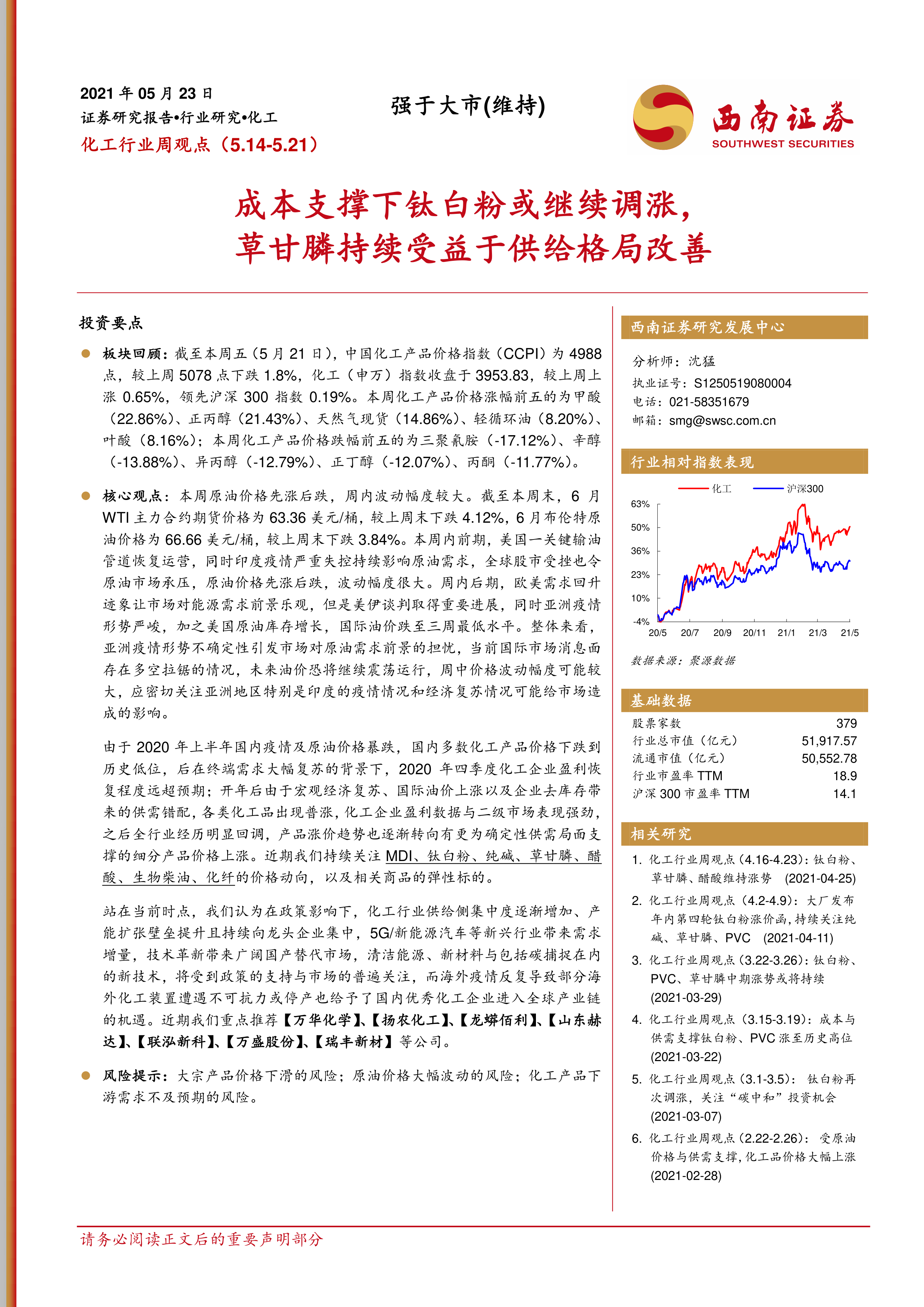 本报告的核心观点是:本周化工行业整体表现强于大市,部分细分领域如钛白粉和草甘膦价格持续上涨,主要受成本支撑和供需格局改善驱动。然而,原油价格波动较大,市场存在多空拉锯,未来油价可能继续震荡。 化工行业长期发展前景向好,主要受益于供给侧集中度提升、新兴行业需求增长以及国产替代空间扩大。报告重点推荐万华化学、扬农化工、龙蟒佰利、山东赫达、联泓新科、万盛股份和瑞丰新材等公司。