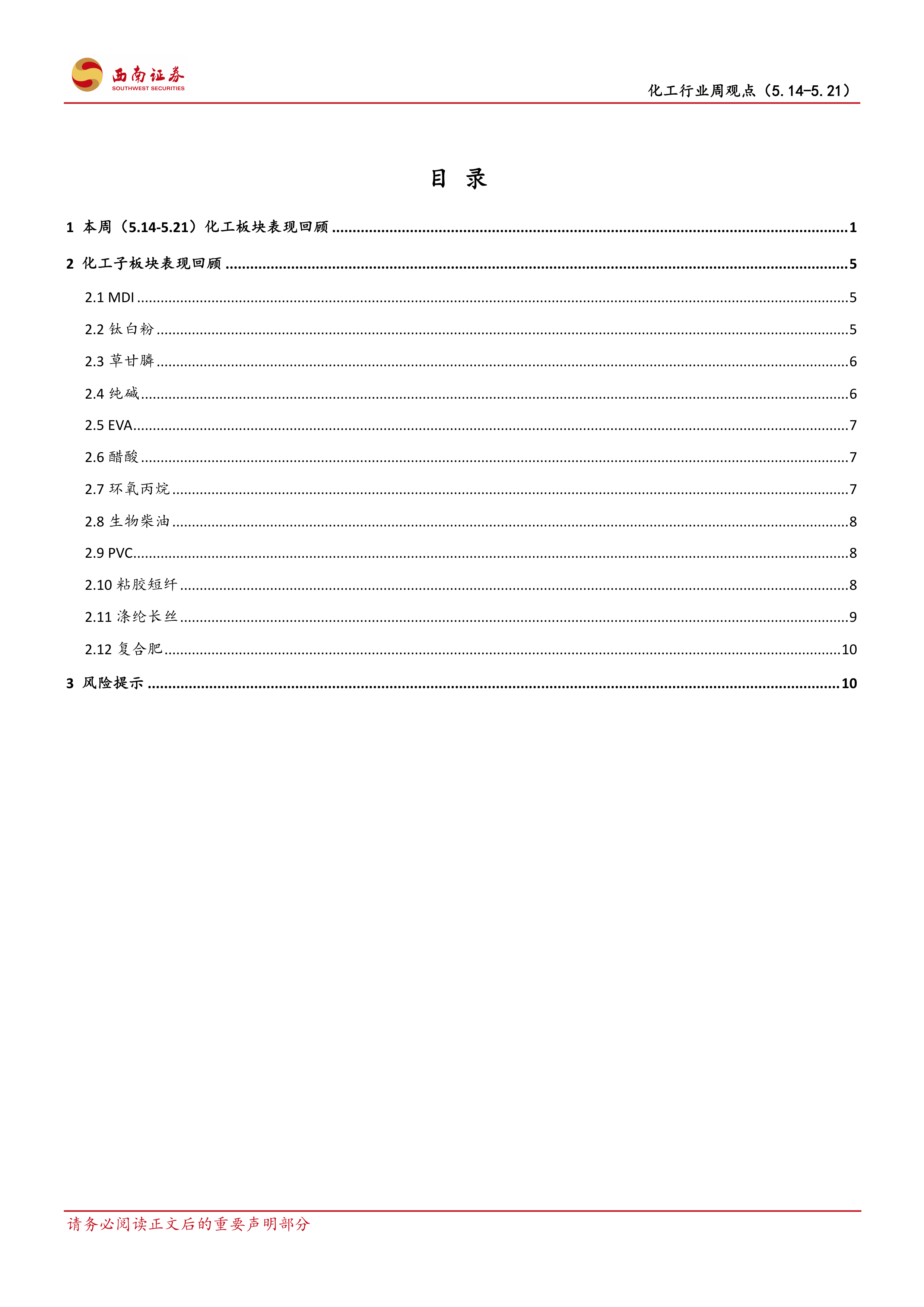 报告详细分析了MDI、钛白粉、草甘膦、纯碱、EVA、醋酸、环氧丙烷、生物柴油、PVC、粘胶短纤、涤纶长丝和复合肥等多个化工子板块的表现,包括价格走势、供需状况、成本变化、库存情况、进出口数据以及行业龙头企业的情况。 以下是一些关键子板块的总结: