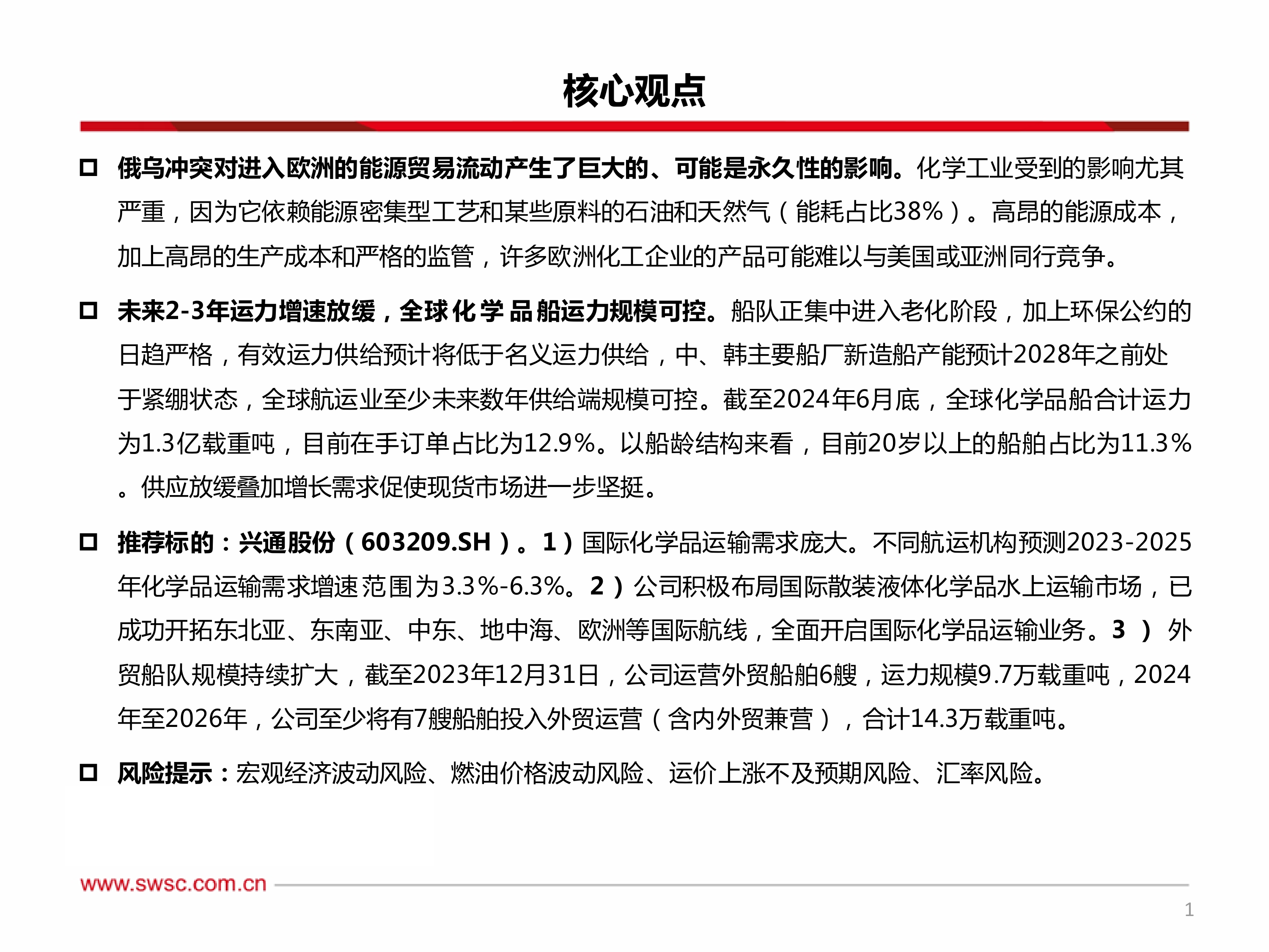 本报告的核心观点是:外贸化学品运输市场,尽管面临宏观经济波动等风险,但由于俄乌冲突导致欧洲能源成本高企,促使全球化工产业链重塑,进而增加了长距离化学品运输需求,且未来2-3年运力增速放缓,供给端规模可控,因此该市场景气度稳步提升,具有较好的投资价值。报告重点推荐兴通股份,其积极布局国际市场,船队规模持续扩大,有望受益于市场增长。