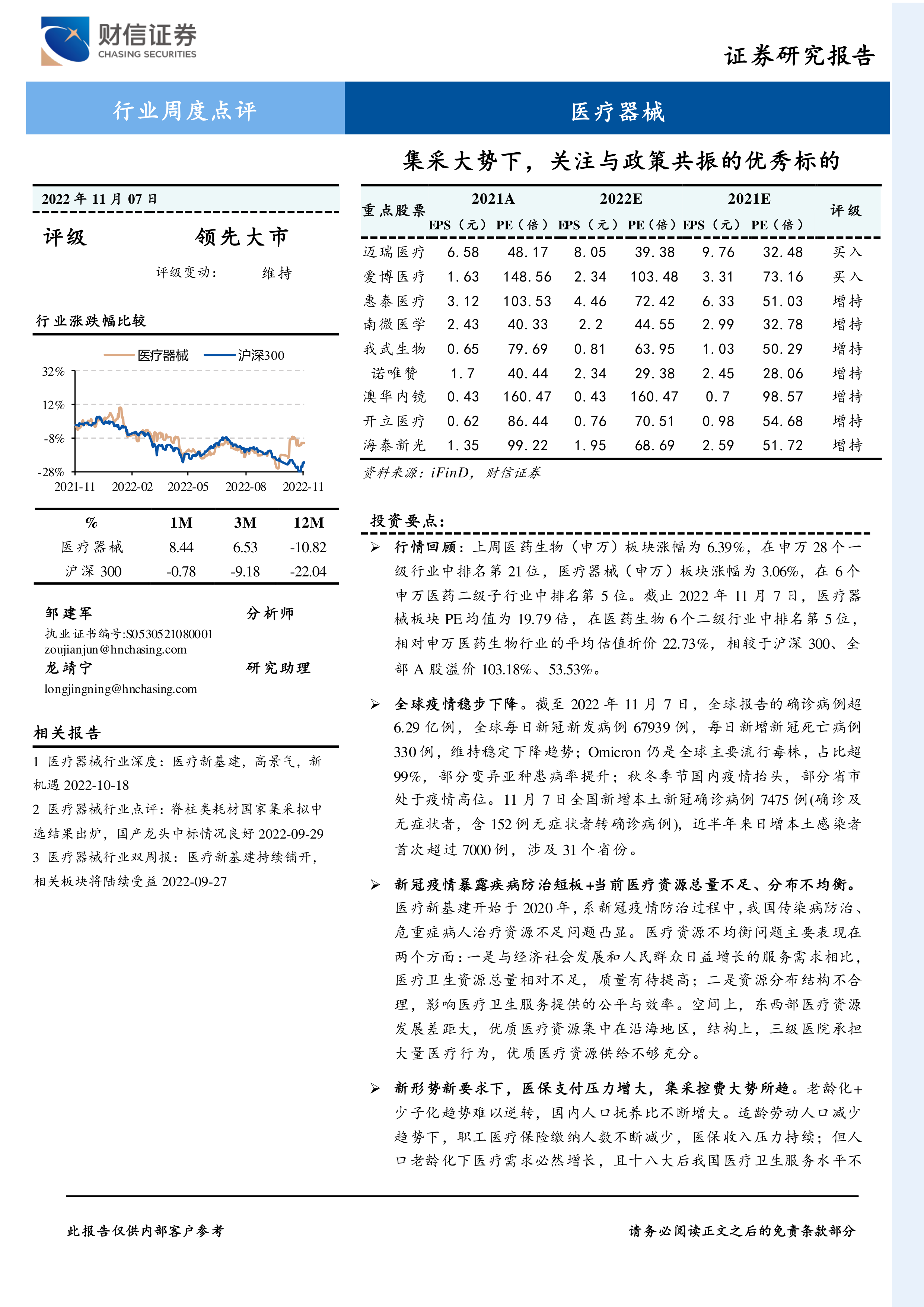 报告最后列举了近期医疗器械行业的重点事件和公司动态,包括锦江电子启动IPO、澳华内镜发布4K超高清消化内镜、赛诺医疗获得医疗器械注册证、波士顿科学公布2022年第三季度财报以及三明采购联盟发布第八次医用耗材集中带量采购函等信息。这些信息反映了行业最新的发展趋势和竞争格局。