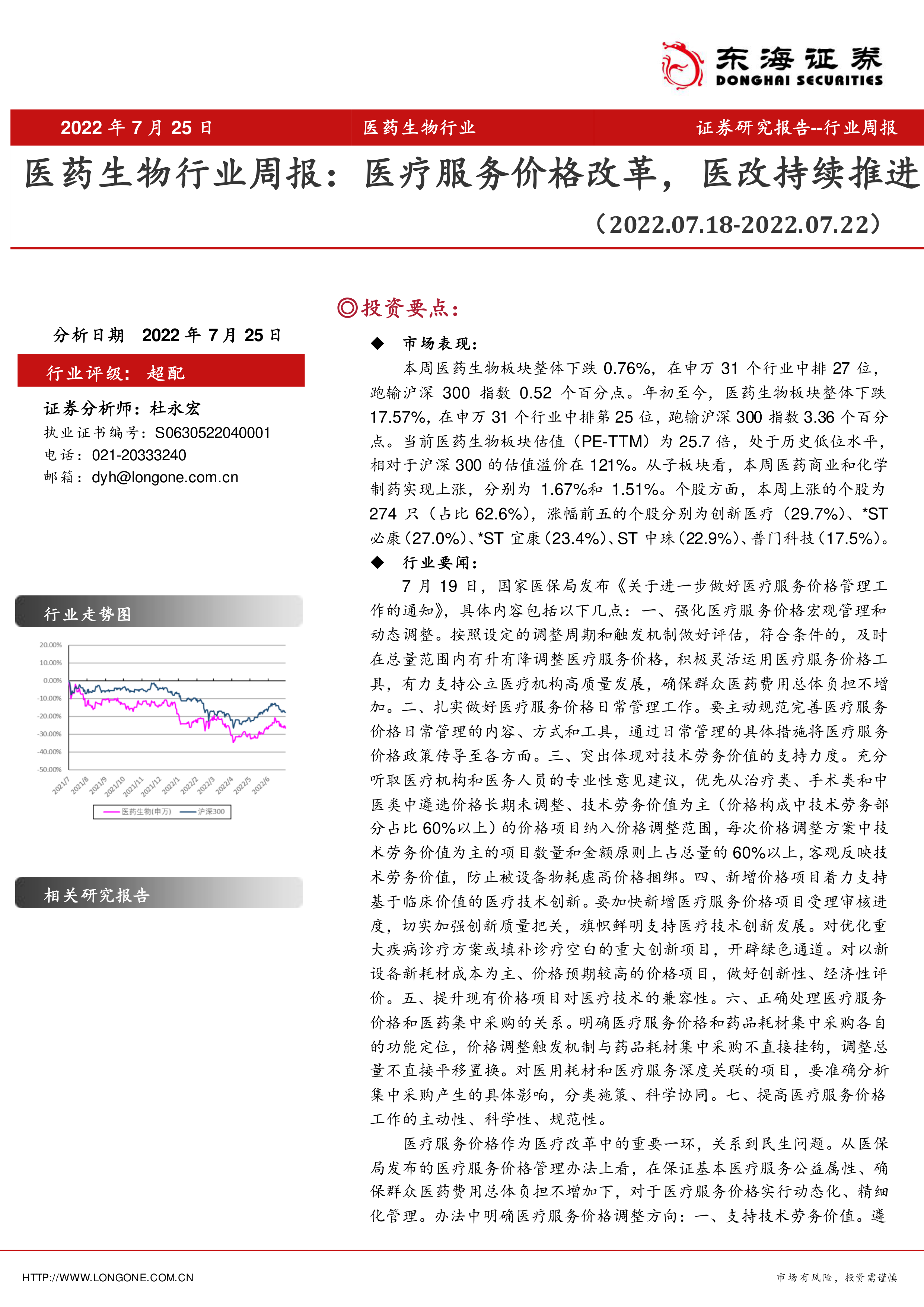 医药生物行业周报: 医疗服务价格改革,医改持续推进