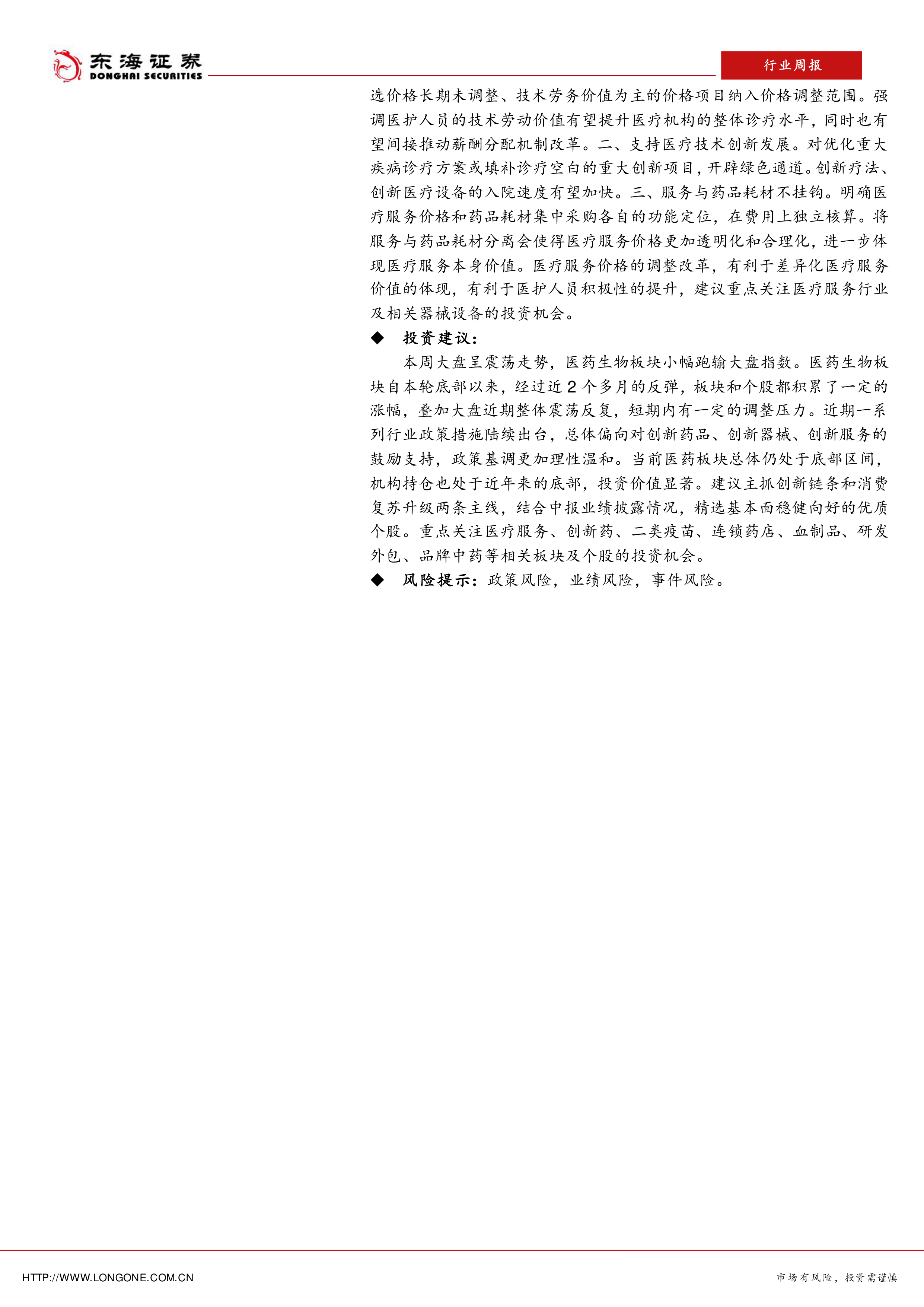 报告最后给出投资建议,建议投资者关注创新链条和消费复苏升级两条主线,精选基本面稳健向好的优质个股,重点关注医疗服务、创新药、二类疫苗、连锁药店、血制品、研发外包、品牌中药等板块及个股的投资机会。同时,报告也提示了政策风险、业绩风险和事件风险等潜在风险。