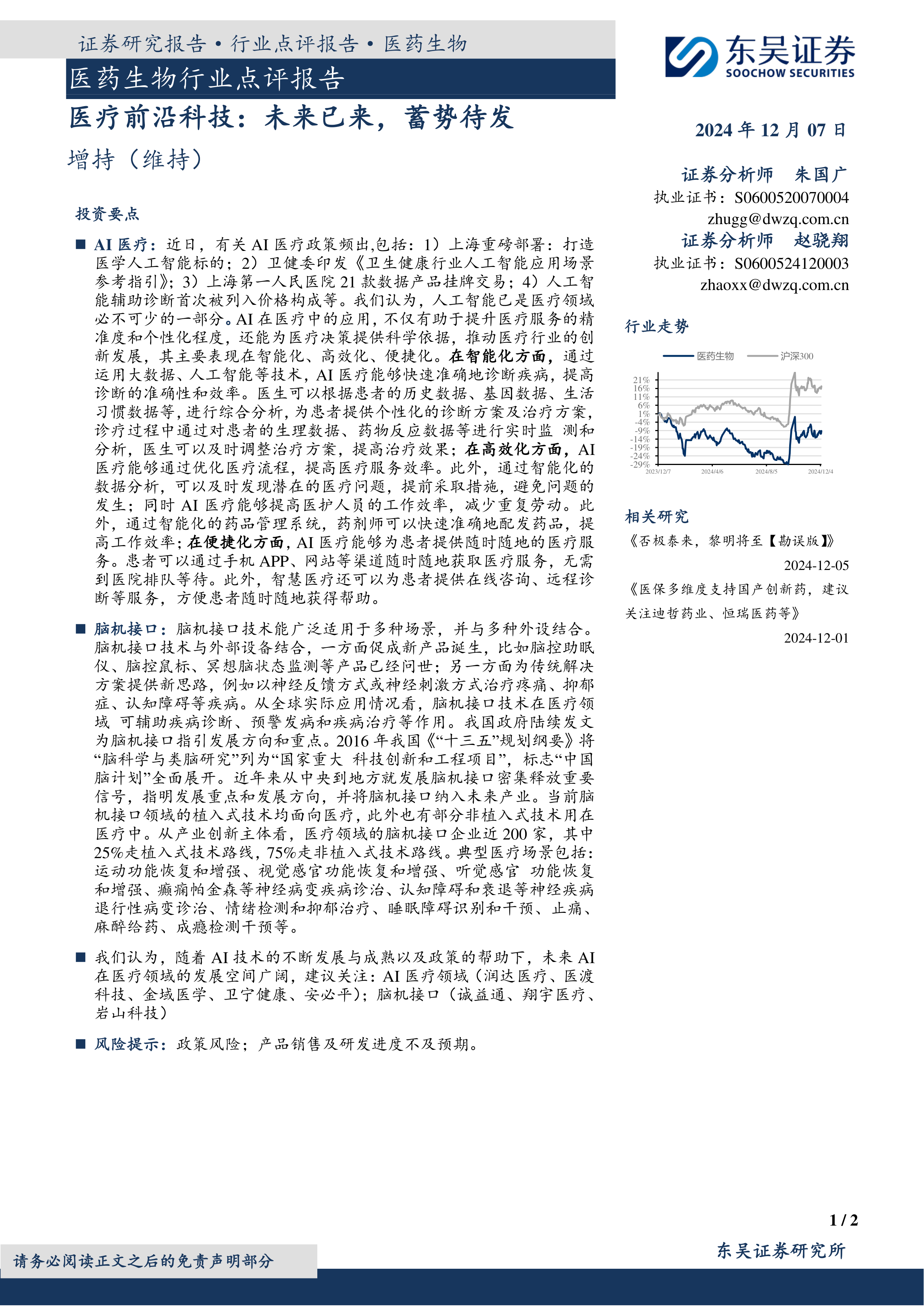 本报告是一份医药生物行业点评报告,重点关注医疗前沿科技,特别是AI医疗和脑机接口技术。报告维持对医药生物行业的“增持”评级。