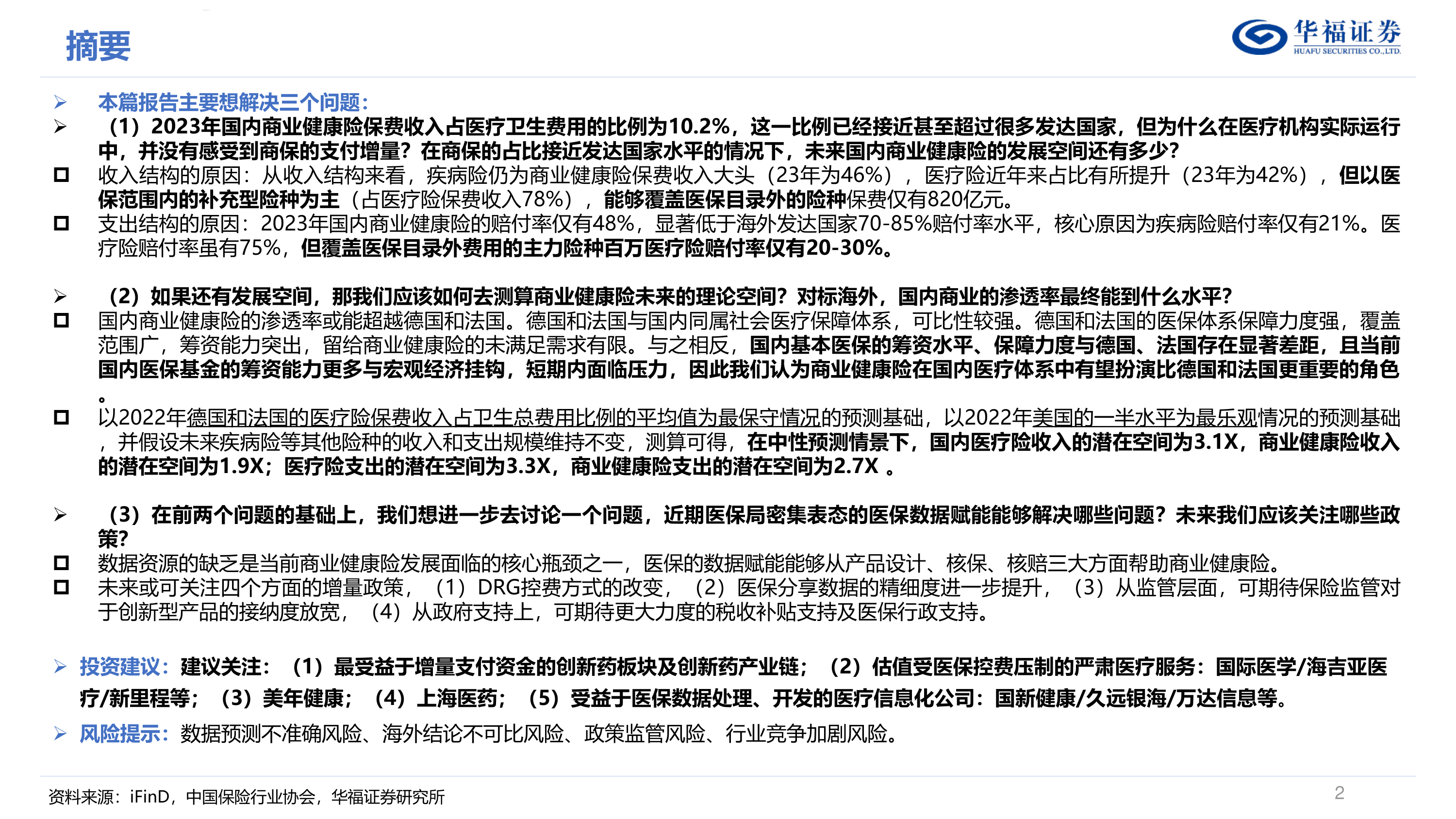 本报告深入分析了国内商业健康险市场现状、发展瓶颈以及未来发展空间。报告通过对美、德、法、日等国商业健康险市场的对比分析,揭示了国内商业健康险发展面临的挑战和机遇。报告认为,医保数据赋能将成为推动国内商业健康险快速发展的关键因素,并展望了未来可能出台的增量政策。 最终,报告提出了具体的投资建议和风险提示,为投资者提供了参考。
