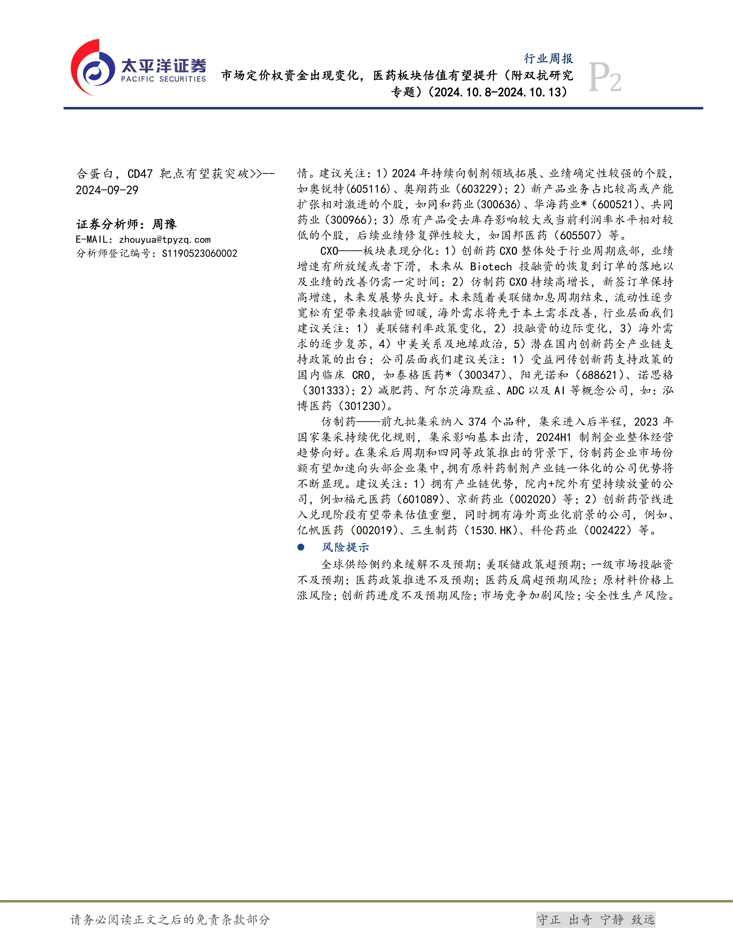 CXO——板块表现分化:1)创新药CXO整体处于行业周期底部,业绩增速有所放缓或者下滑,未来从Biotech投融资的恢复到订单的落地以及业绩的改善仍需一定时间;2)仿制药CXO持续高增长,新签订单保持高增速,未来发展势头良好。未来随着美联储加息周期结束,流动性逐步宽松有望带来投融资回暖,海外需求将先于本土需求改善,行业层面我们建议关注:1)美联储利率政策变化,2)投融资的边际变化,3)海外需求的逐步复苏,4)中美关系及地缘政治,5)潜在国内创新药全产业链支持政策的出台;公司层面我们建议关注:1)受益网传创新药支持政策的国内临床CRO,如泰格医药*(300347)、阳光诺和(688621)、诺思格(301333);2)减肥药、阿尔茨海默症、ADC以及AI等概念公司,如:泓博医药(301230)。