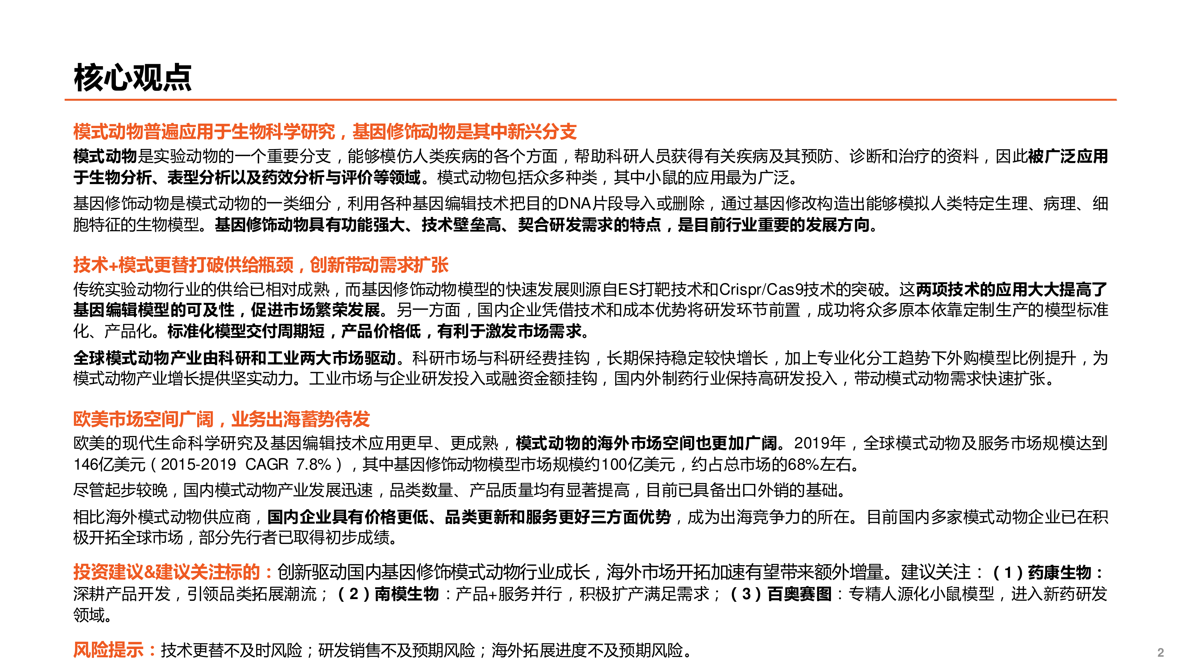 本报告的核心观点是:模式动物,特别是基因修饰动物,在生物科学研究和药物研发中扮演着越来越重要的角色。技术进步(ES打靶技术和Crispr/Cas9技术)和产业模式创新(标准化模型的出现)打破了供给瓶颈,推动了需求扩张。国内模式动物产业发展迅速,凭借价格、品类更新和服务优势,具备显著的国际竞争力,并积极开拓海外市场,有望获得额外增量。