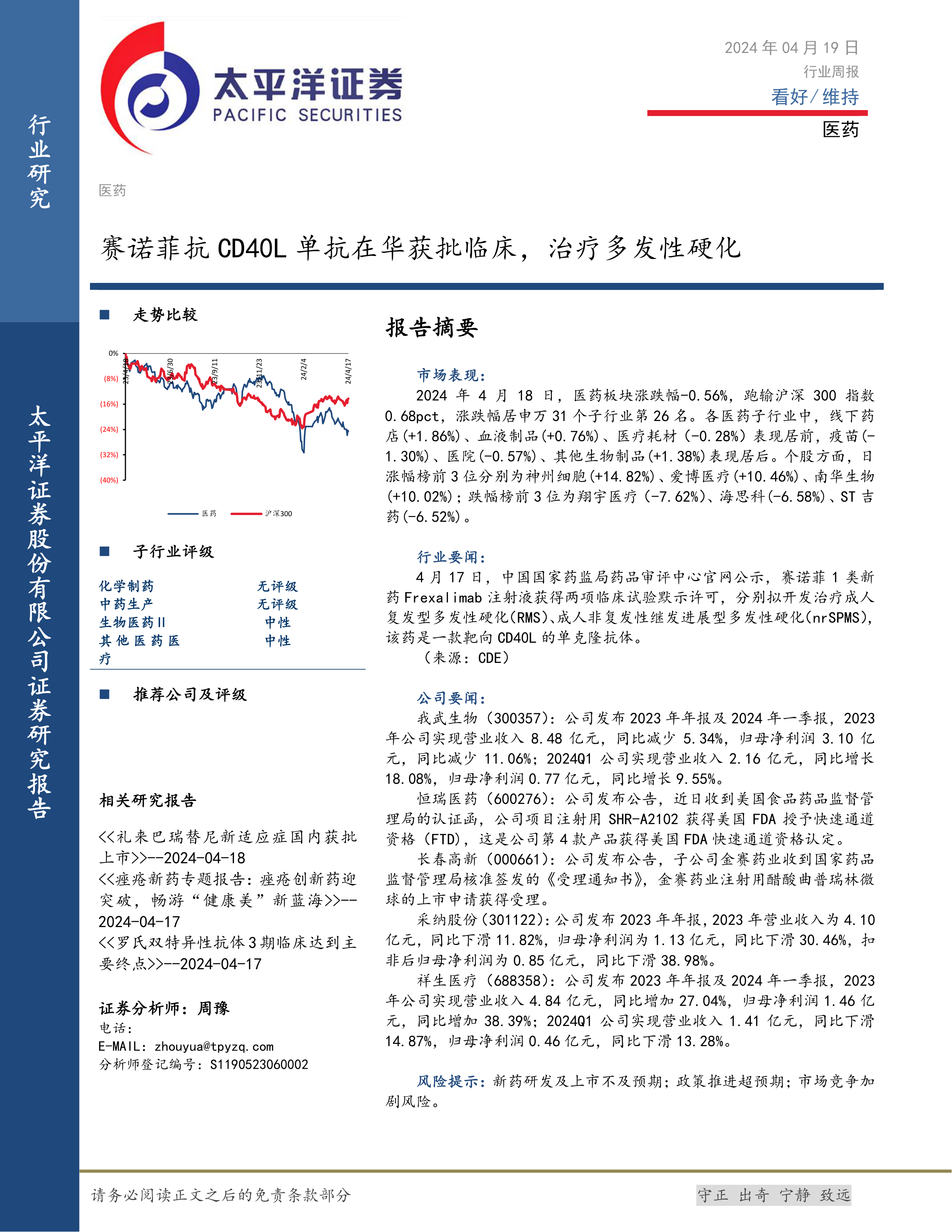 本报告的核心观点是:2024年4月18日,医药板块整体表现弱于大盘,但部分子行业和个股表现突出。赛诺菲抗CD40L单抗在华获批临床试验,为多发性硬化治疗带来新的希望,值得关注。部分公司发布了2023年年报和2024年一季报,业绩表现分化明显,需进一步分析。