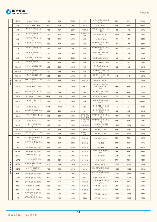 本周市场回顾部分主要概述了上周布伦特和WTI原油期货价格的涨跌幅,以及石化和化工产品价格的涨跌幅前五位产品。同时,报告还分析了国金化工重点跟踪产品的价差变化情况,并总结了石化和基础化工板块的指数变动情况。数据显示,原油价格上涨,部分石化产品价格上涨,部分化工产品价格下跌,石化和基础化工板块指数均跑低。